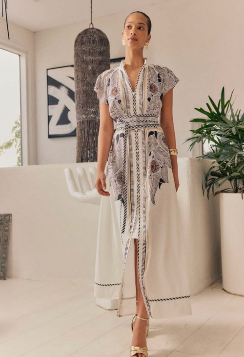 Malika Viscose Dobby Contrast Bind Flutter Sleeve Dress | Ivory Casablanca