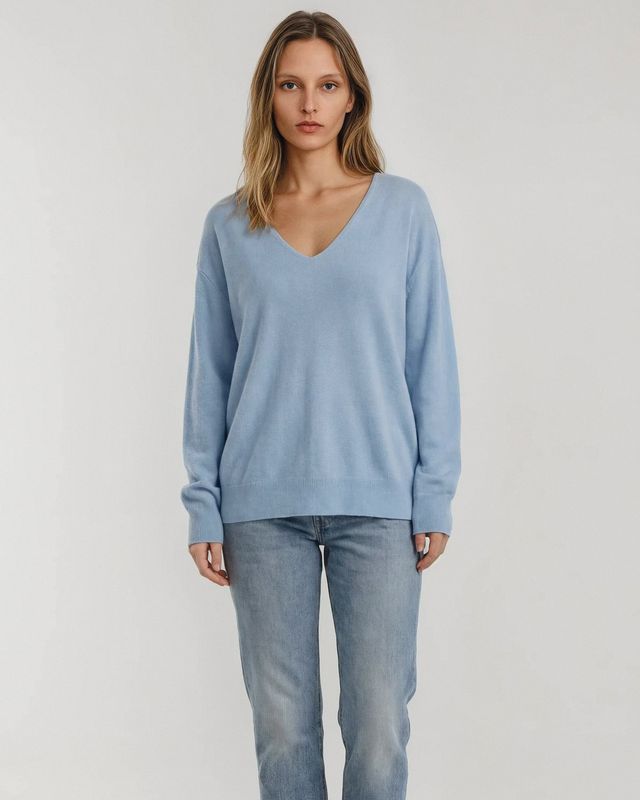 V-Neck, dropped shoulders, ribbed trims Relaxed, flattering fit Flowy, sculptural silhouette perfect for layering or wearing solo Hand-Wash or Machine Wash COLD 44% Wool, 19% Cashmere, 34% PA, 3% PU