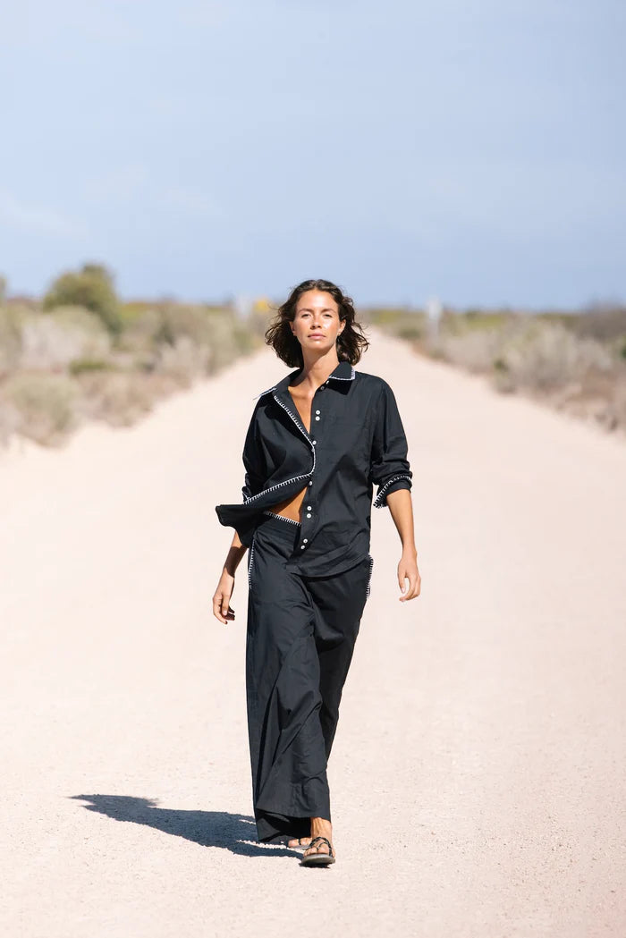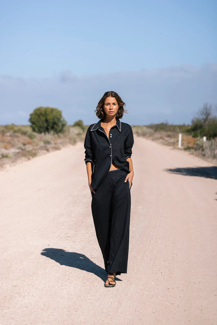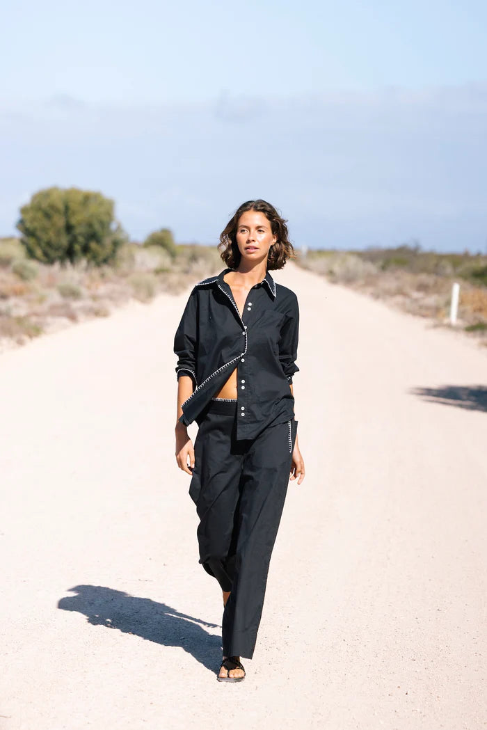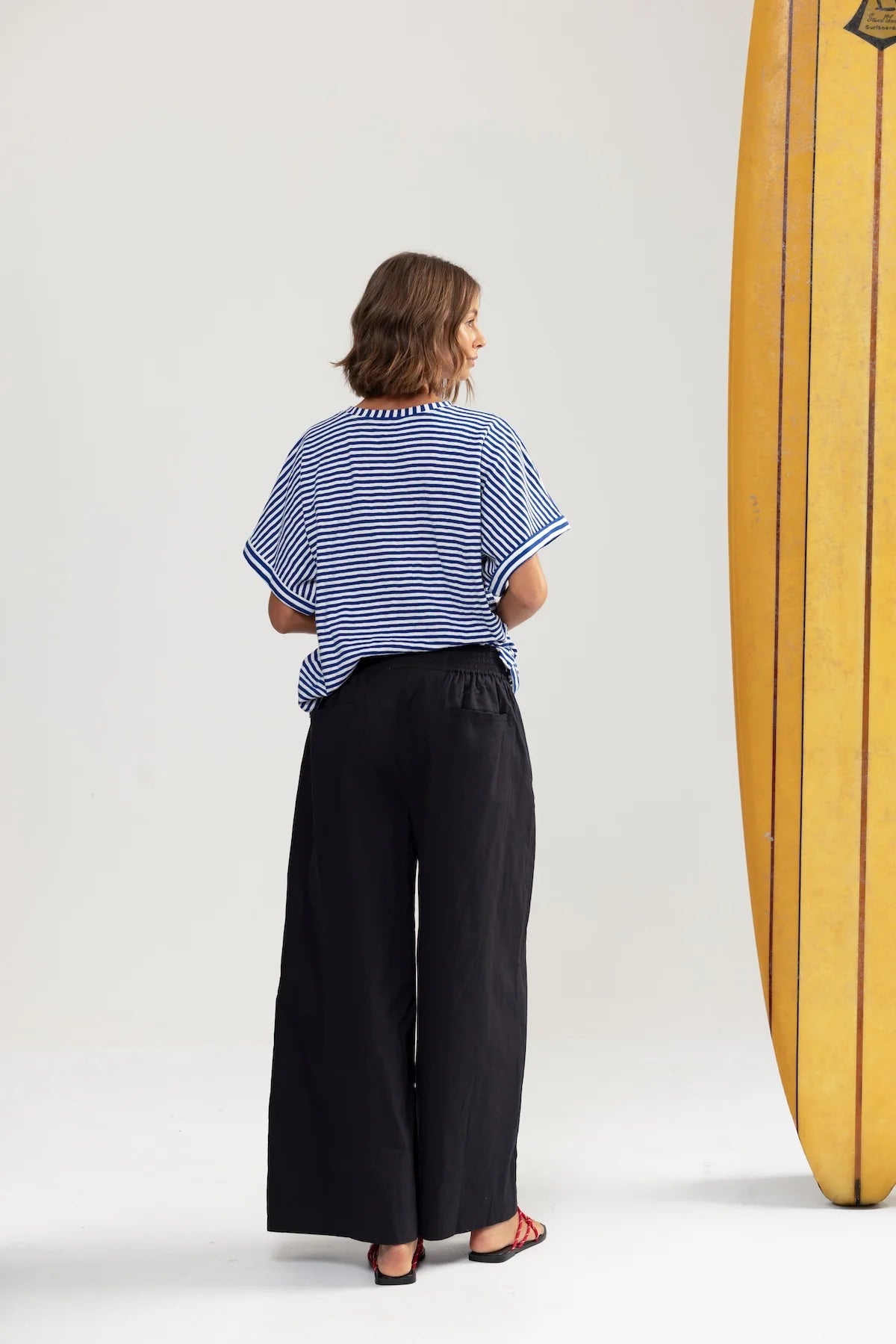 Bringing relaxed polish with quilt stitch detailing, a wide leg silhouette, and an elasticated back for everyday comfort. for a hot girl walk, talk, lunch. Throw on & go with absolutely everything including our 5276 tee, for a French nautical chic, or all black BANG BANG matching shirt set. Add all three to cart.