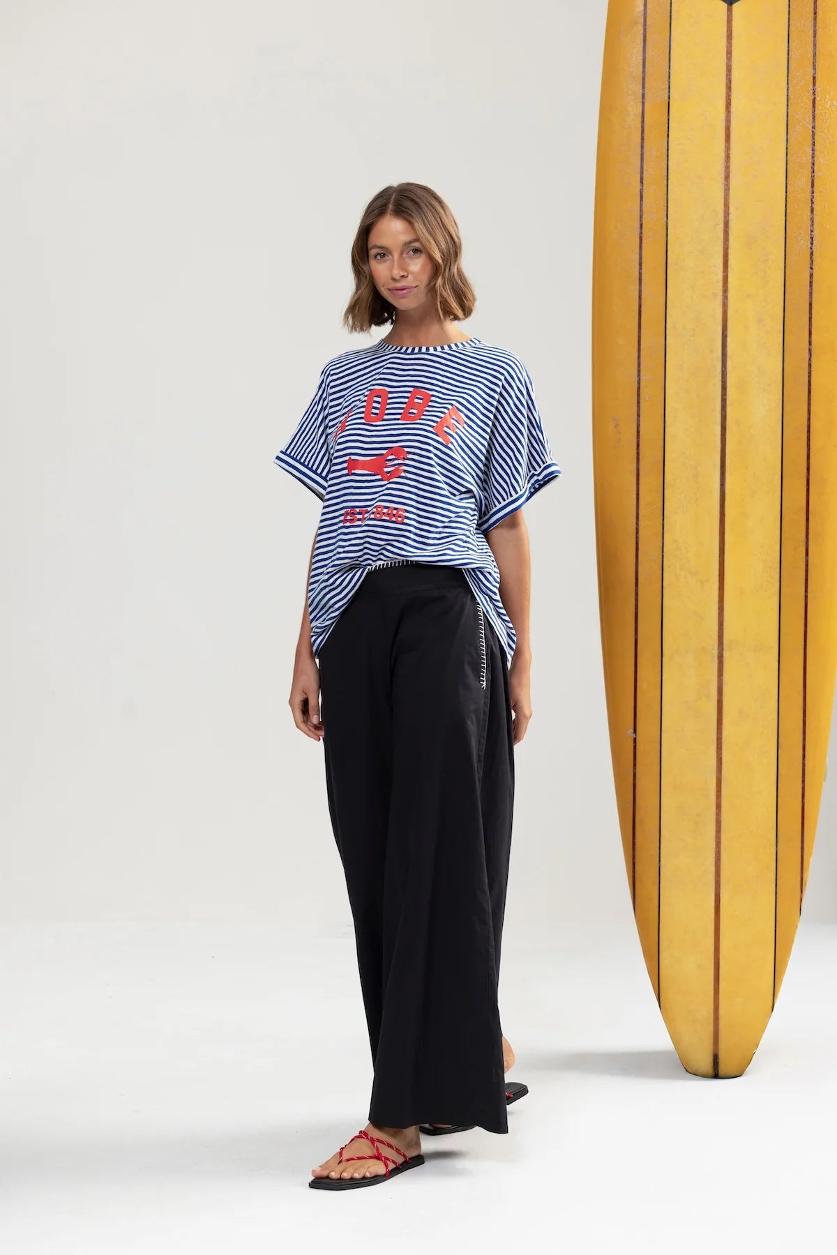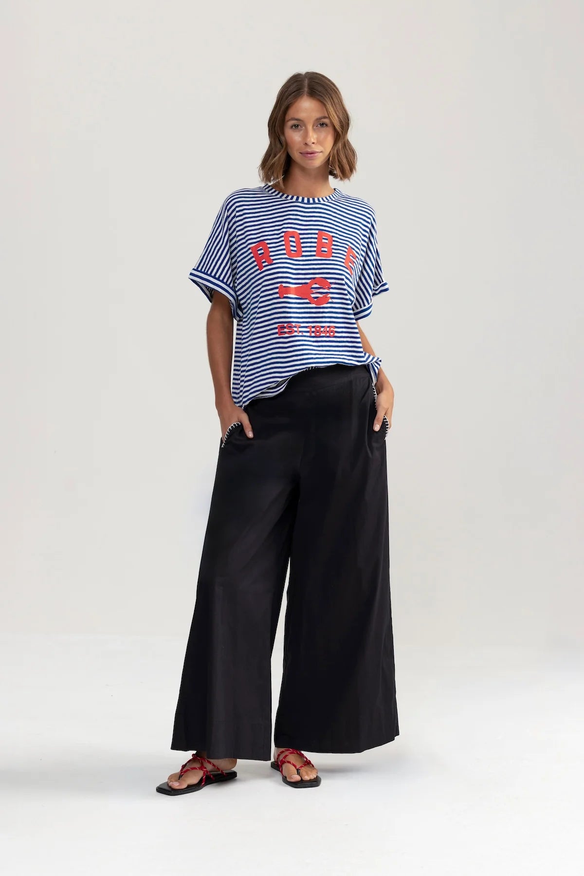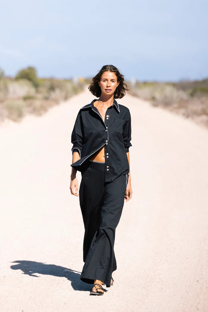 Bringing relaxed polish with quilt stitch detailing, a wide leg silhouette, and an elasticated back for everyday comfort. for a hot girl walk, talk, lunch. Throw on & go with absolutely everything including our 5276 tee, for a French nautical chic, or all black BANG BANG matching shirt set. Add all three to cart.