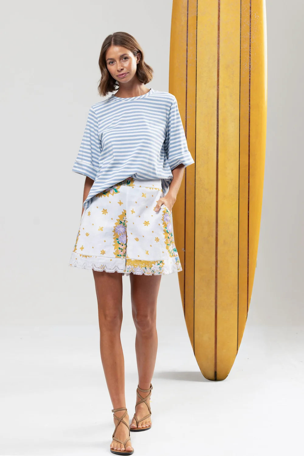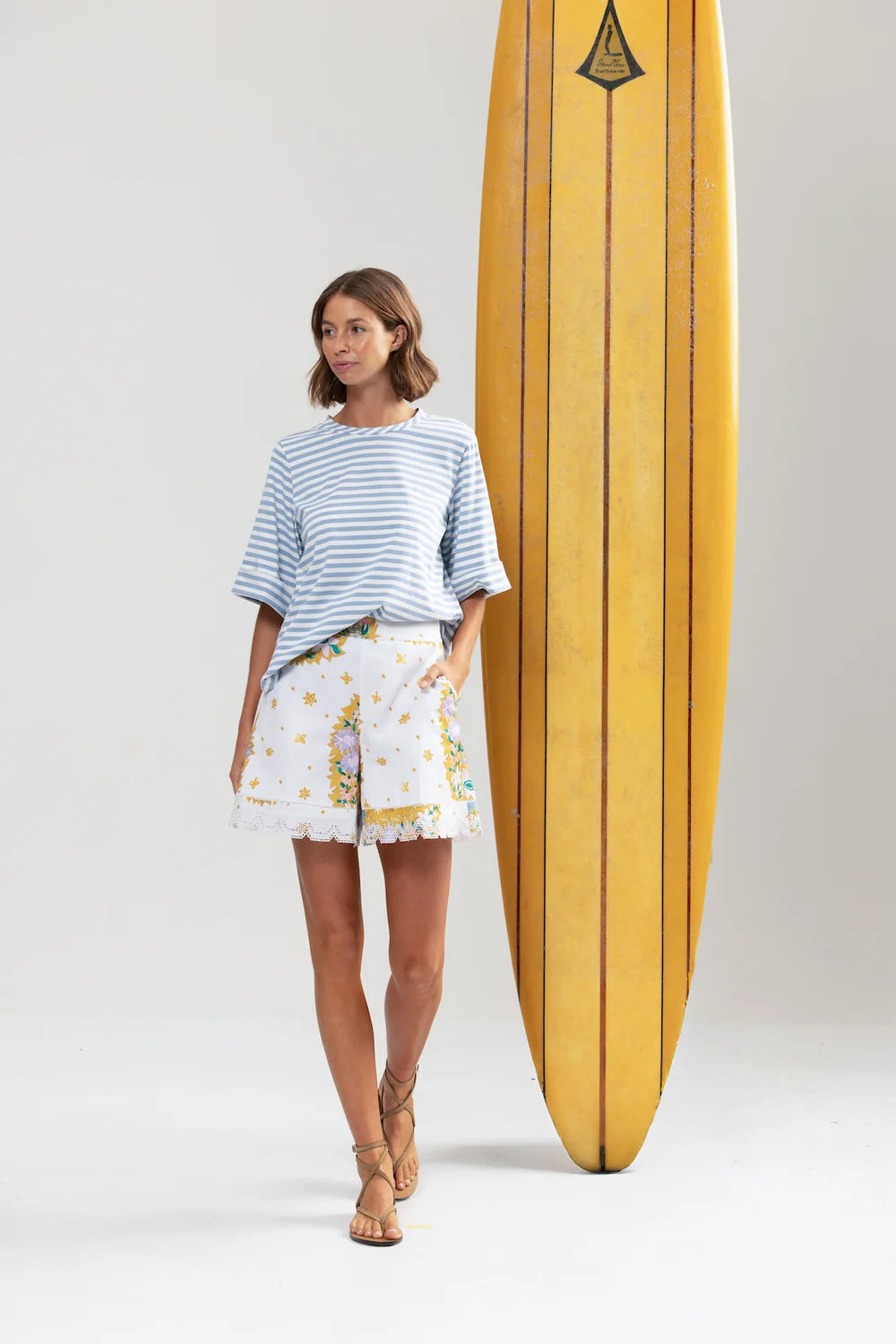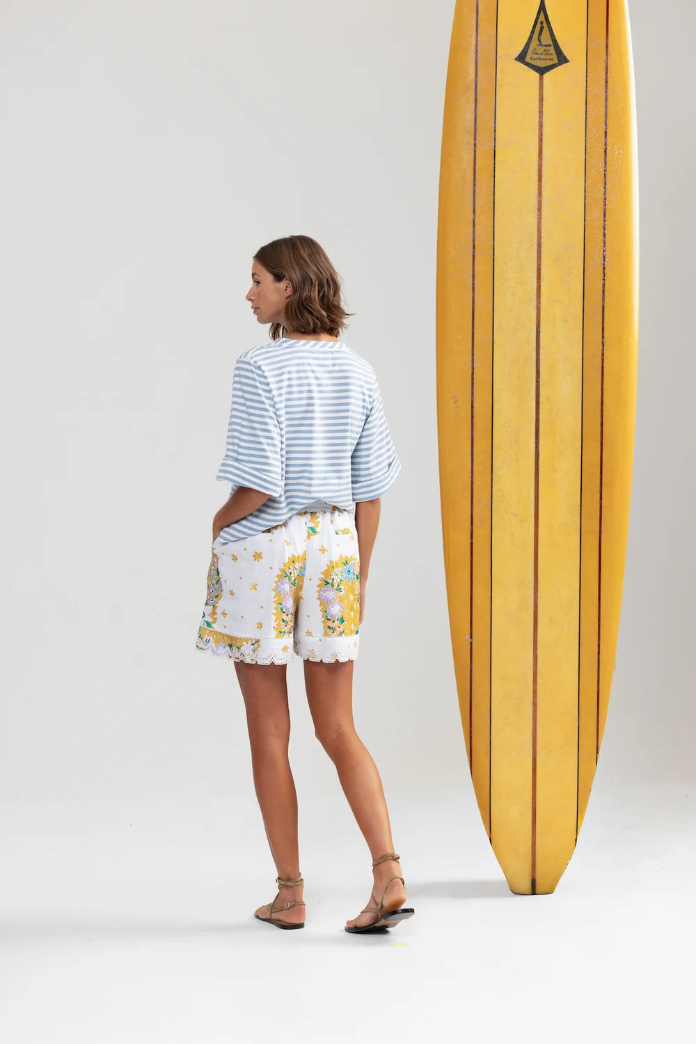 THE FARM shorts is BInny nostalgic, sun-drenched colours, & the sweetest scallop edge trim. Easy pull-on flattering flat shorts with the prettiest details, side pockets & room to move. Match it with the THE BEACH HOTEL linen tank to set & forget or the YORKES baby blue Tshirt.