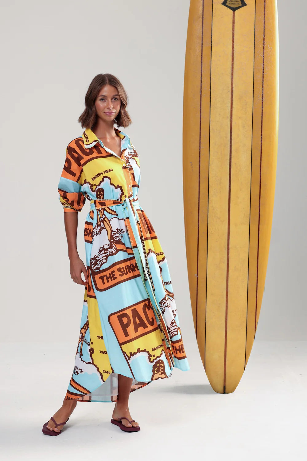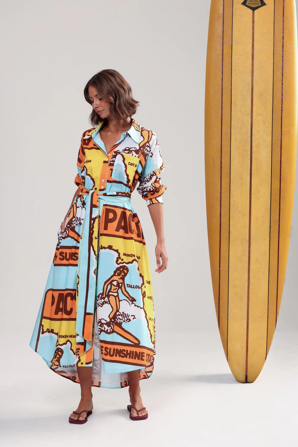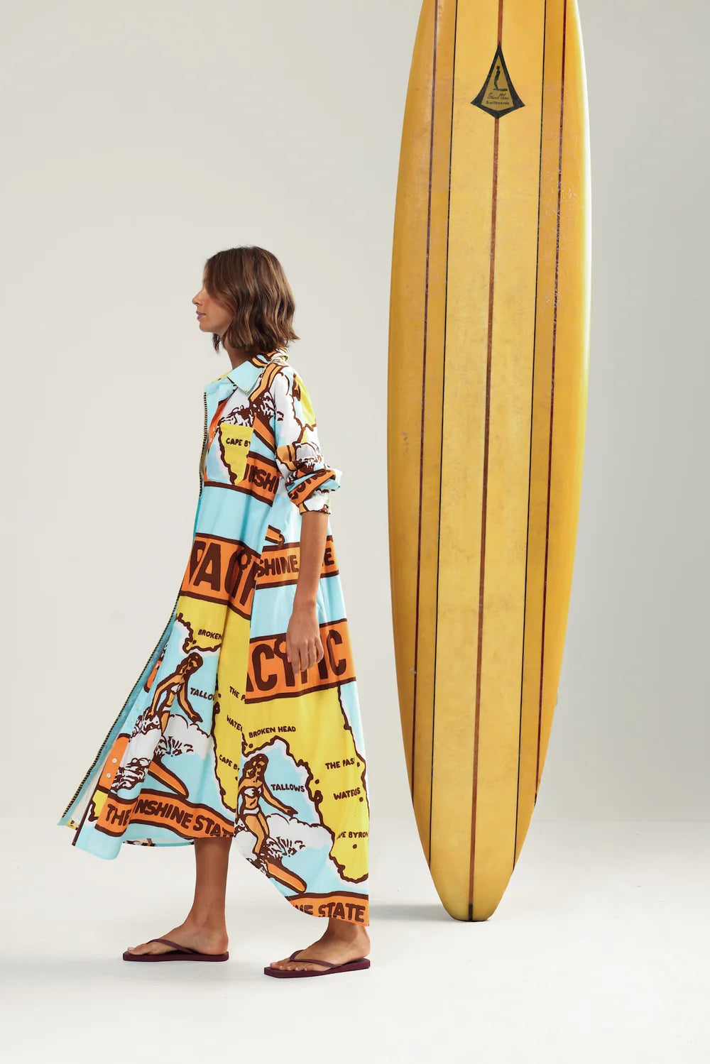 A beautiful combo of colours and built for long lunches. THREE BLUE DUCKS features a vintage east coast map, contrast sunshine blanket stitching, and a removable tie for when you need more room for dessert. It’s all cotton, all comfort, all holiday. Fully lined in softest floatiest cotton cambric.