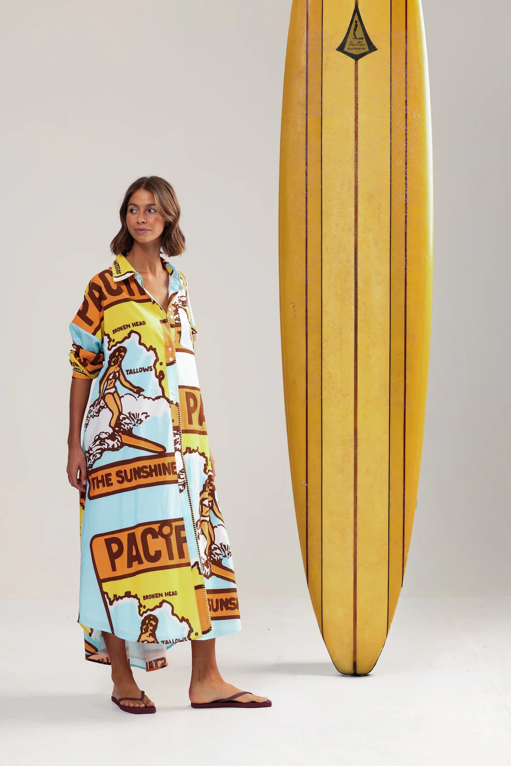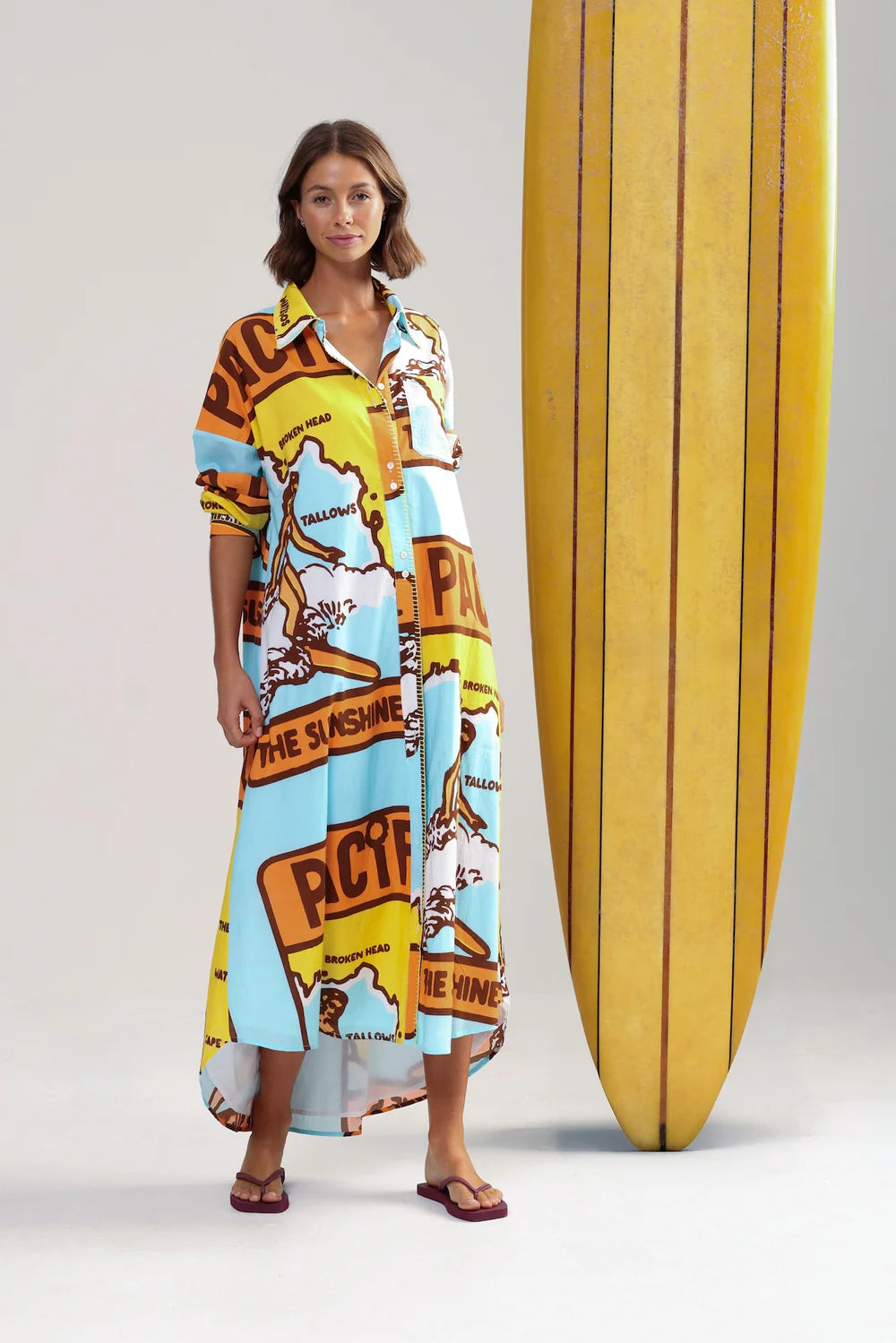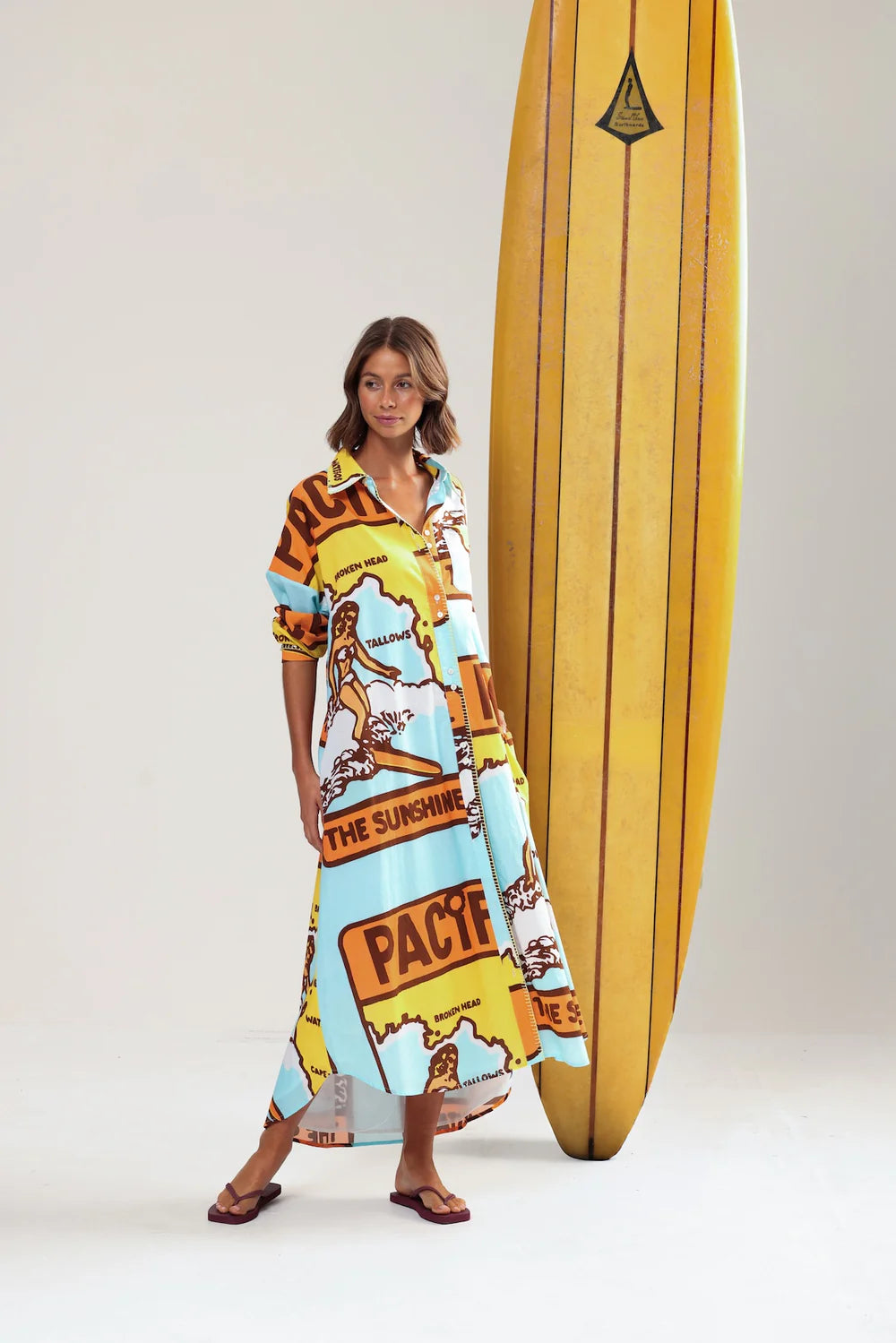 A beautiful combo of colours and built for long lunches. THREE BLUE DUCKS features a vintage east coast map, contrast sunshine blanket stitching, and a removable tie for when you need more room for dessert. It’s all cotton, all comfort, all holiday. Fully lined in softest floatiest cotton cambric.