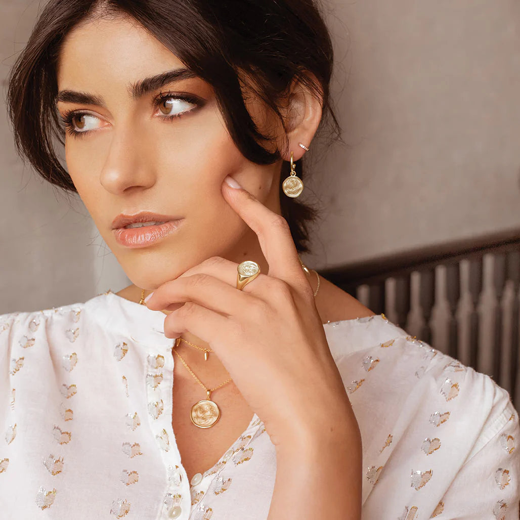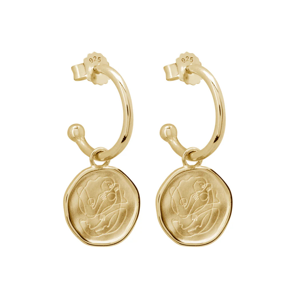 Yellow Gold Hoop Earrings with etched Motherhood drawing on pendant.