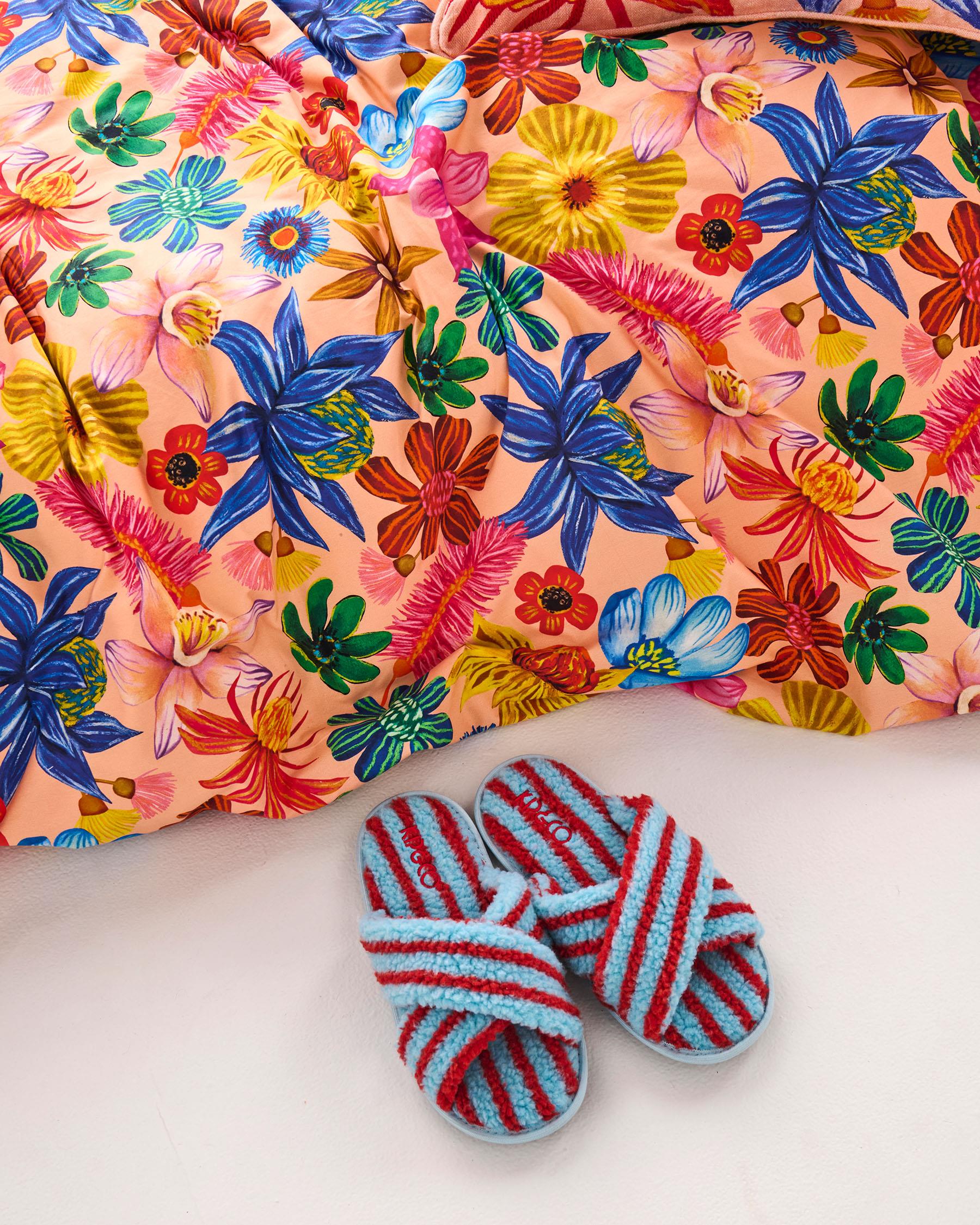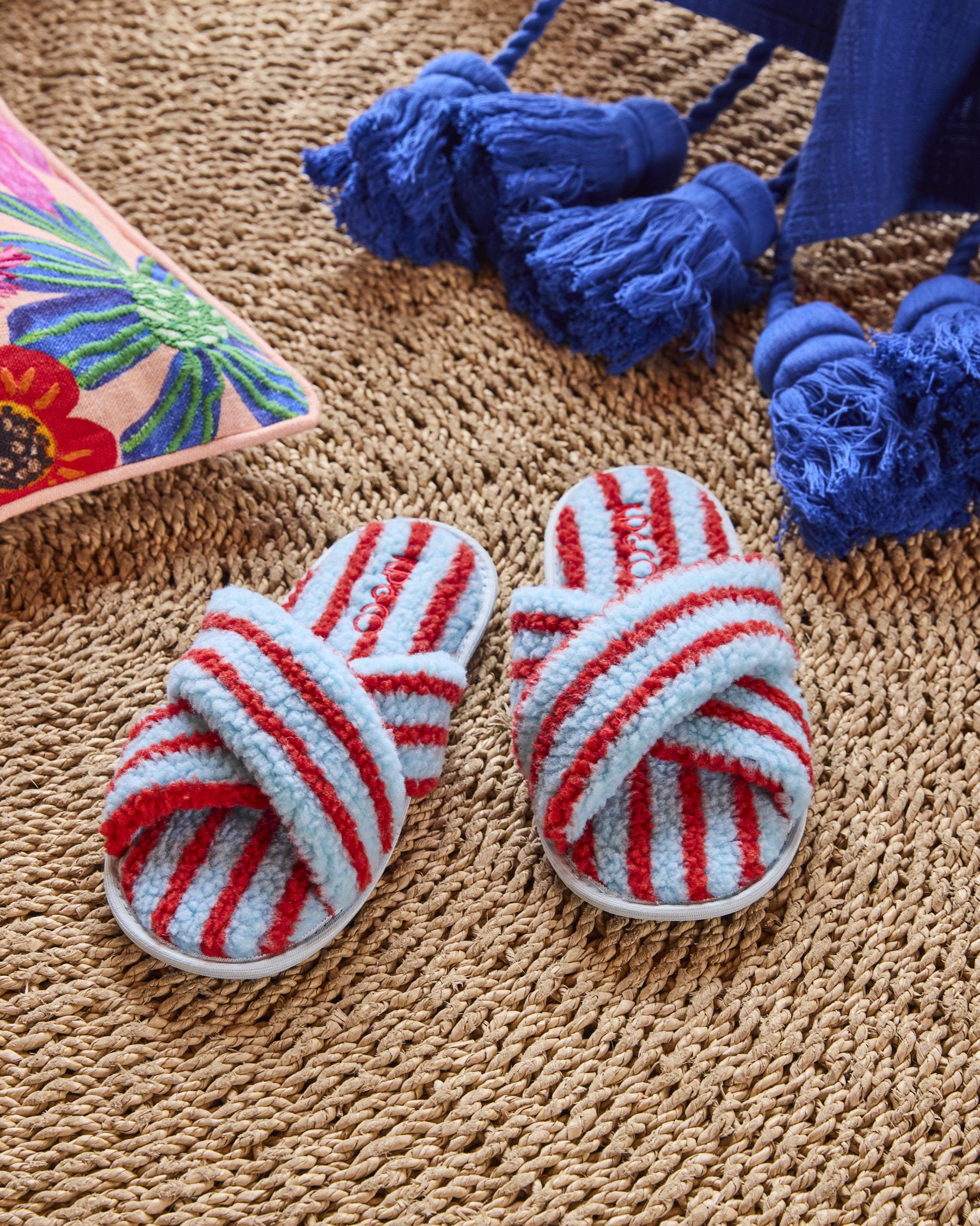 Slide into summer comfort! Our Hamilton Stripe Sherpa Adult Slippers wrap your feet in soft, snug sherpa with cheerful sky blue and tomato red stripes that bring vacation vibes to every step. Perfect for lazy mornings on the balcony, barefoot afternoons at home, or evening chill-outs under the sunset, these slippers are your go-to for all-day lounging. Easy to slip on, impossible to leave behind - summer leisure just got a whole lot lush.