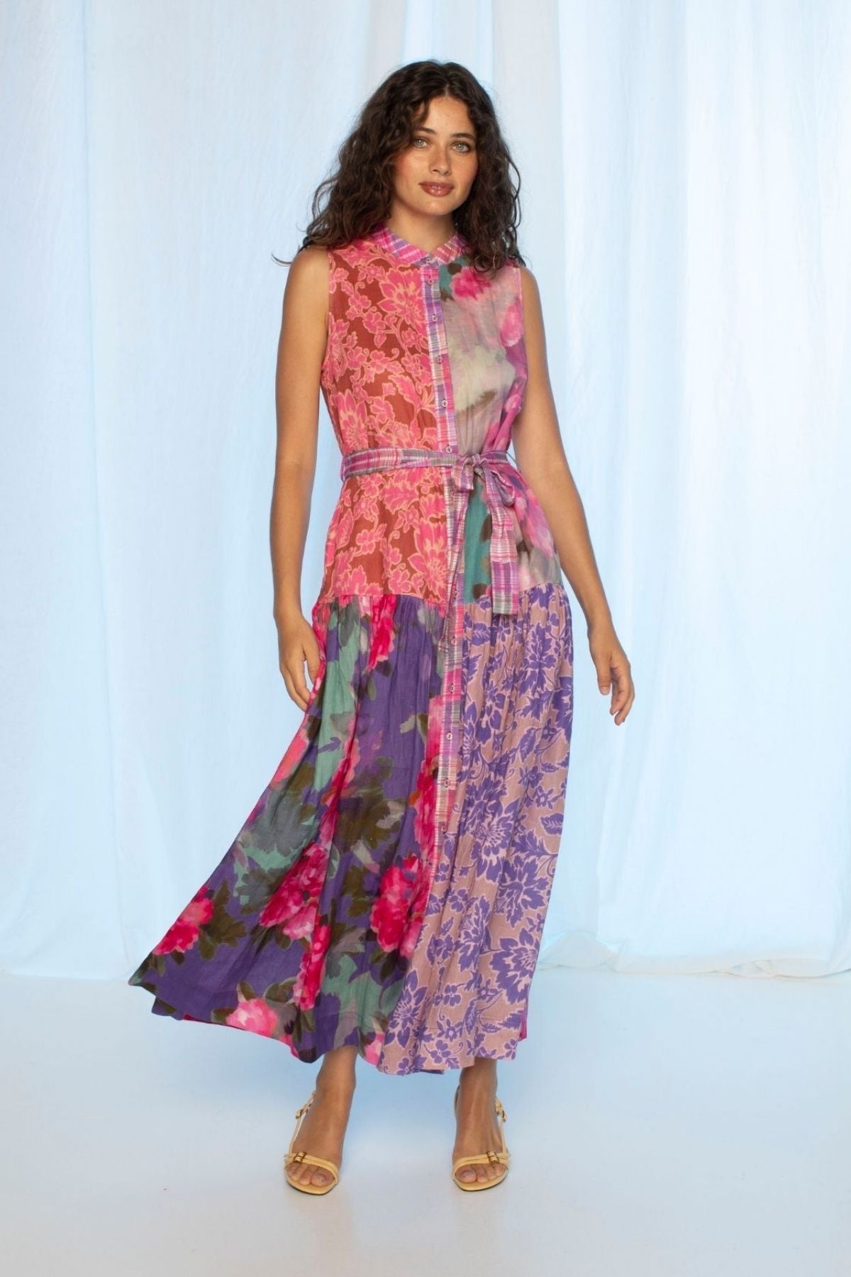 The Kennedy Maxi Dress is your ultimate summer staple. This sleeveless beauty features a button-down front, a thin adjustable belt to cinch the waist, and a playful mix of floral prints that make it both fun and effortlessly chic for the season.
