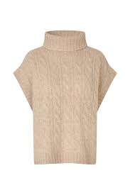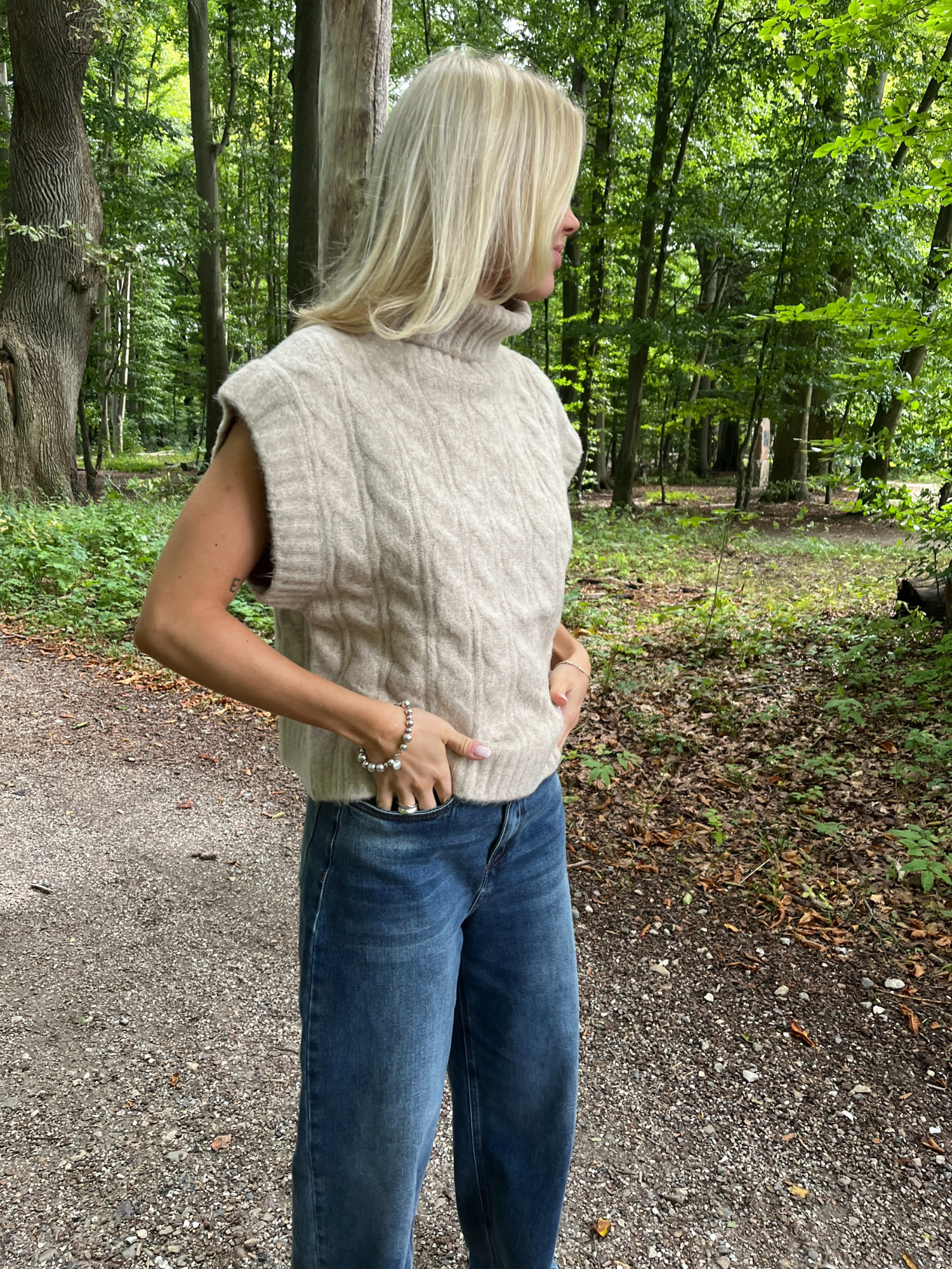 The Fresno vest is a soft knit with a classic cable pattern and a high neck. It features a relaxed fit with ribbed edges at the hem and armholes. The perfect layering piece for autumn looks.
