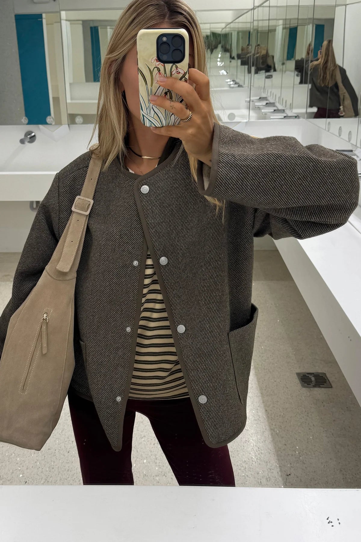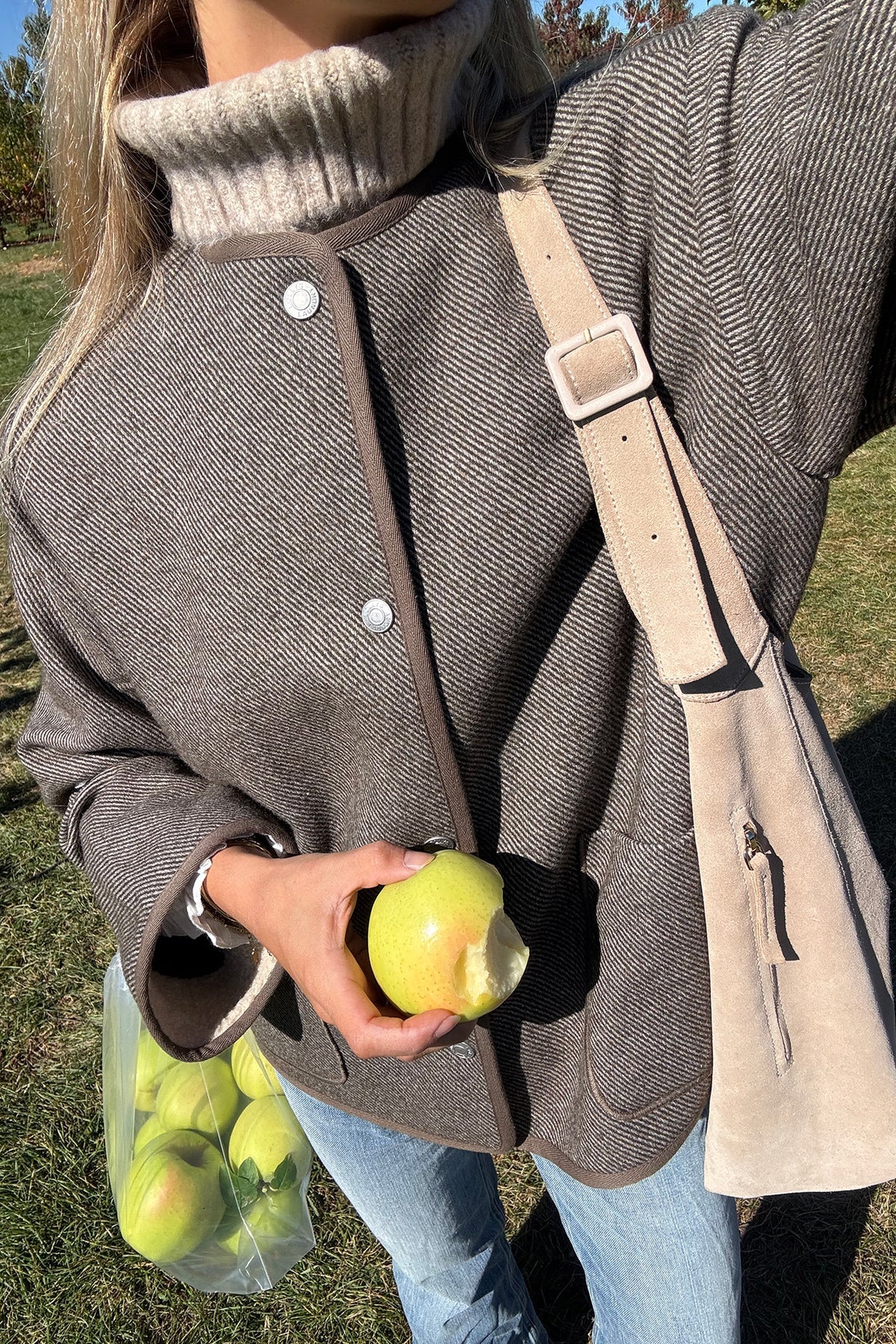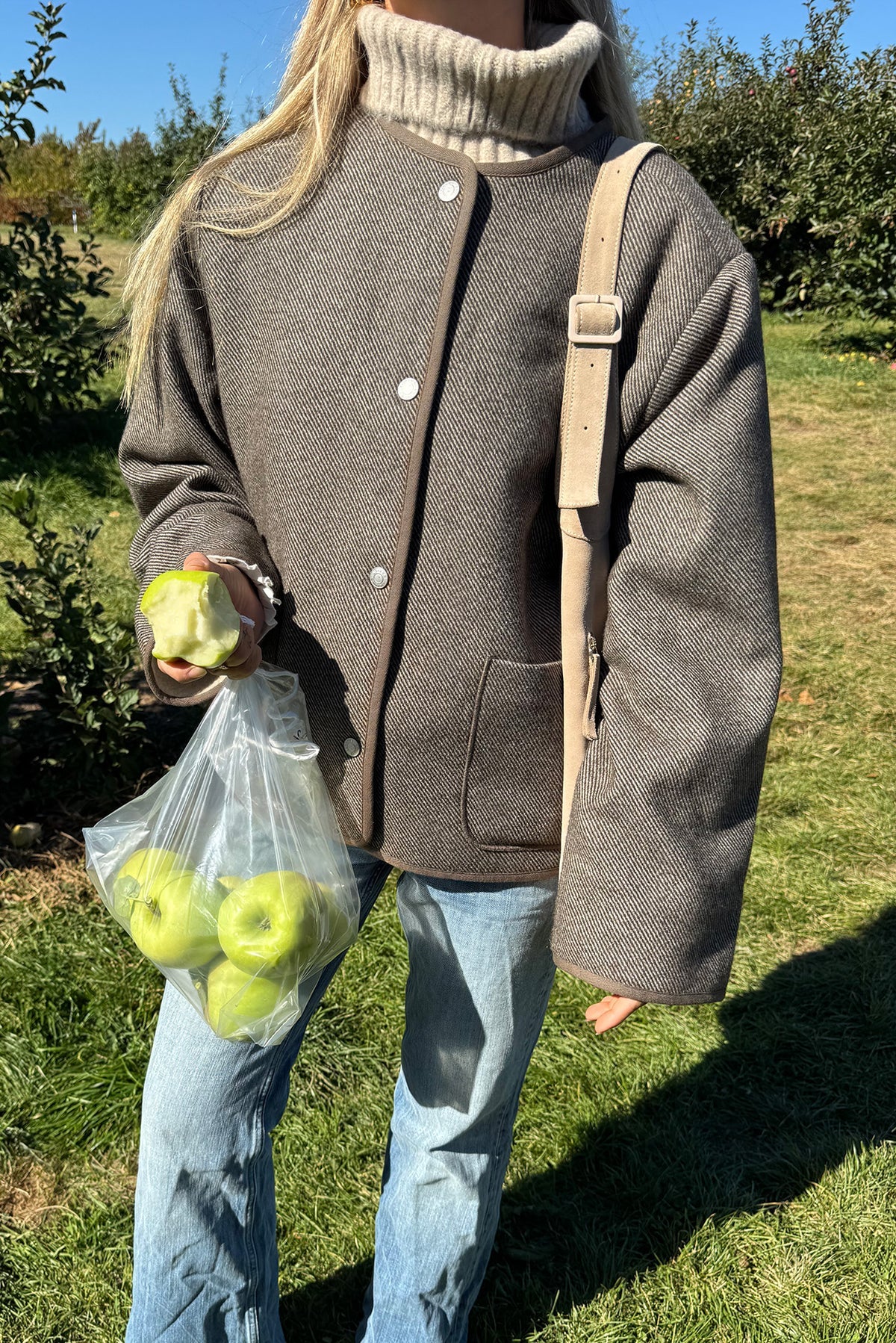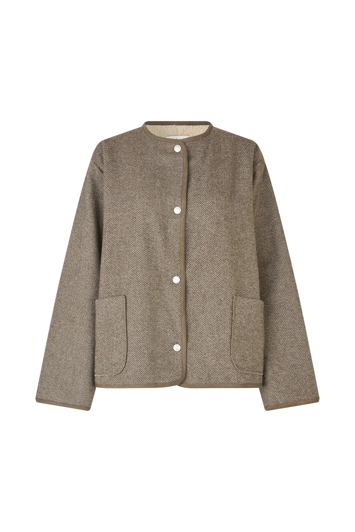 a soft Lollys favourite with a relaxed look and cozy teddy lining. This short jacket is made from a warm brown wool blend with a classic herringbone weave and contrast binding. It features a soft cream teddy lining inside the body and sleeve hems, and is detailed with metal buttons on the front. The silhouette is relaxed and boxy – perfect for everyday wear and layering.