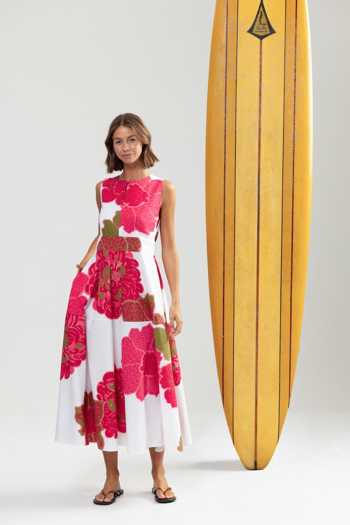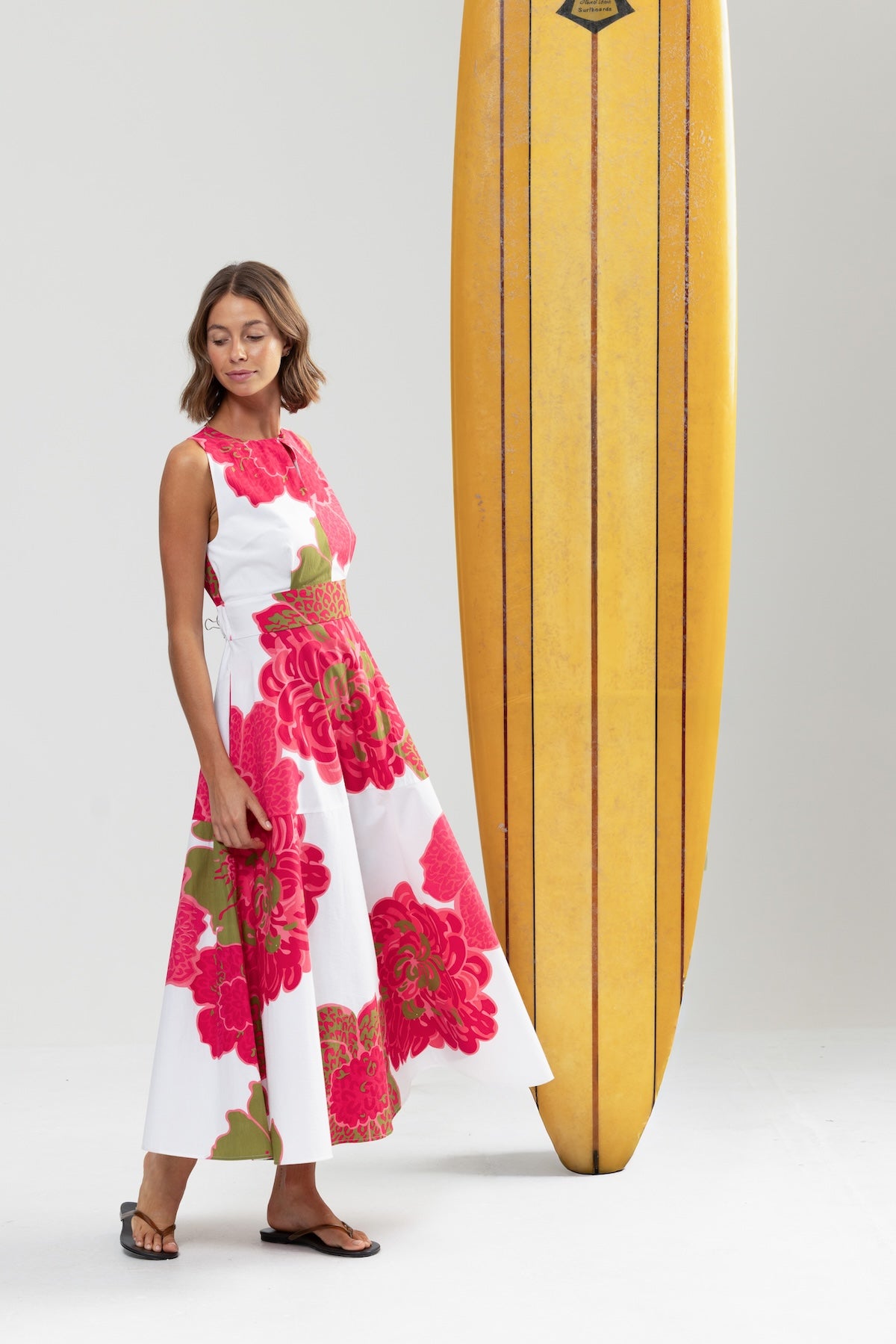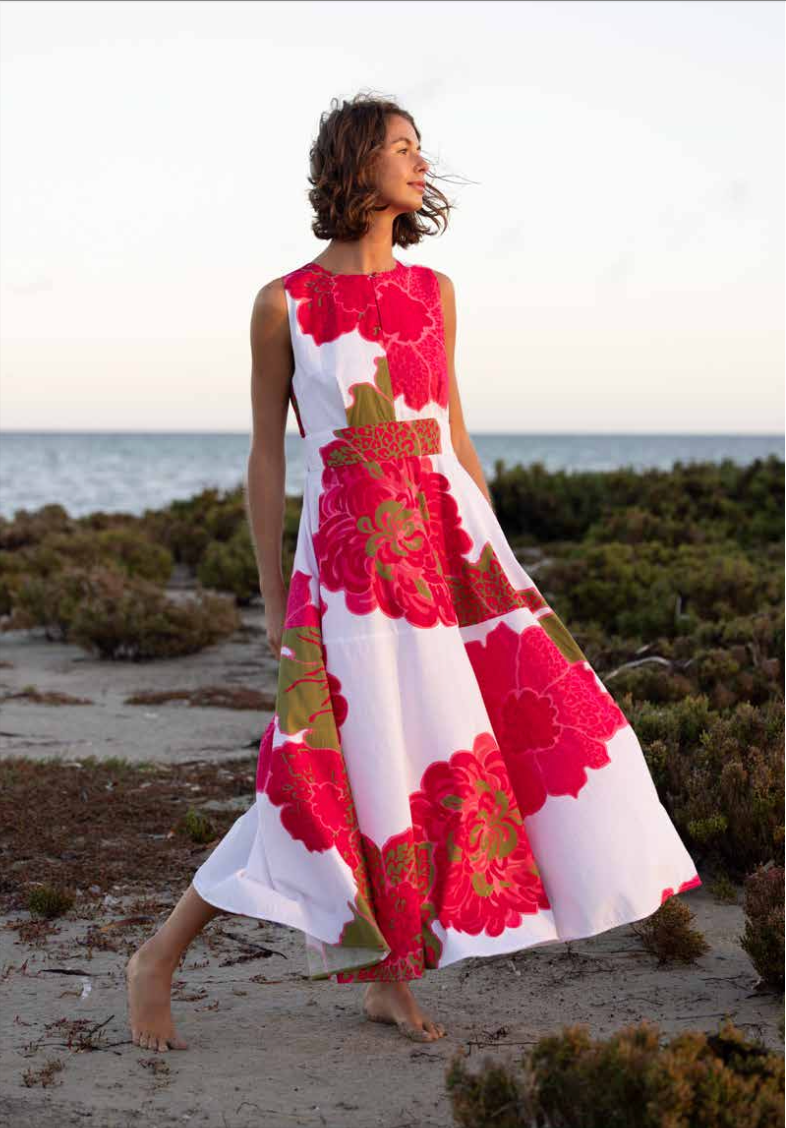 BOUGAINVILLEA (pronounced boo-gan-vil-ya) is vibrant a bit thorny, famous for its spectacular, papery, colourful flowers. Thriving in heat and sun, they add stunning colourful fun with relatively little fuss once established. Sounds like most of our friends. This dress is sure to add all of the above to many summer occasions for years to come. Spectacular papery cotton feel fabric, the perfect summer print & dress. Just add spicy margs & white kitten heeled flops for casual. Or self belt it for crisp riesling & rattan weave white flats for dressy. A brilliant multi tasker just like your fine self.