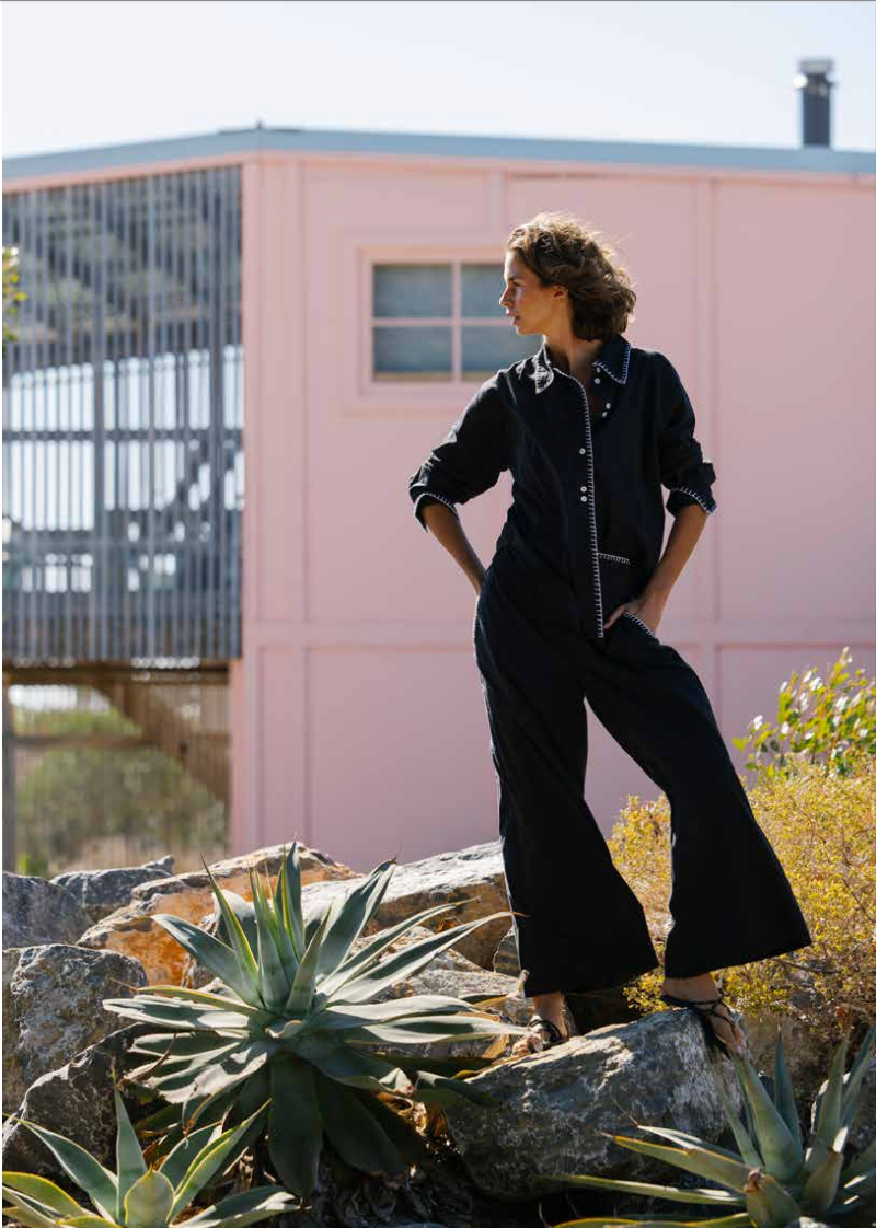 100% Cotton Wide Leg Pants with White Quilt Stitch Detail, Fly Front, Elastic Back Waistband & Side pockets.