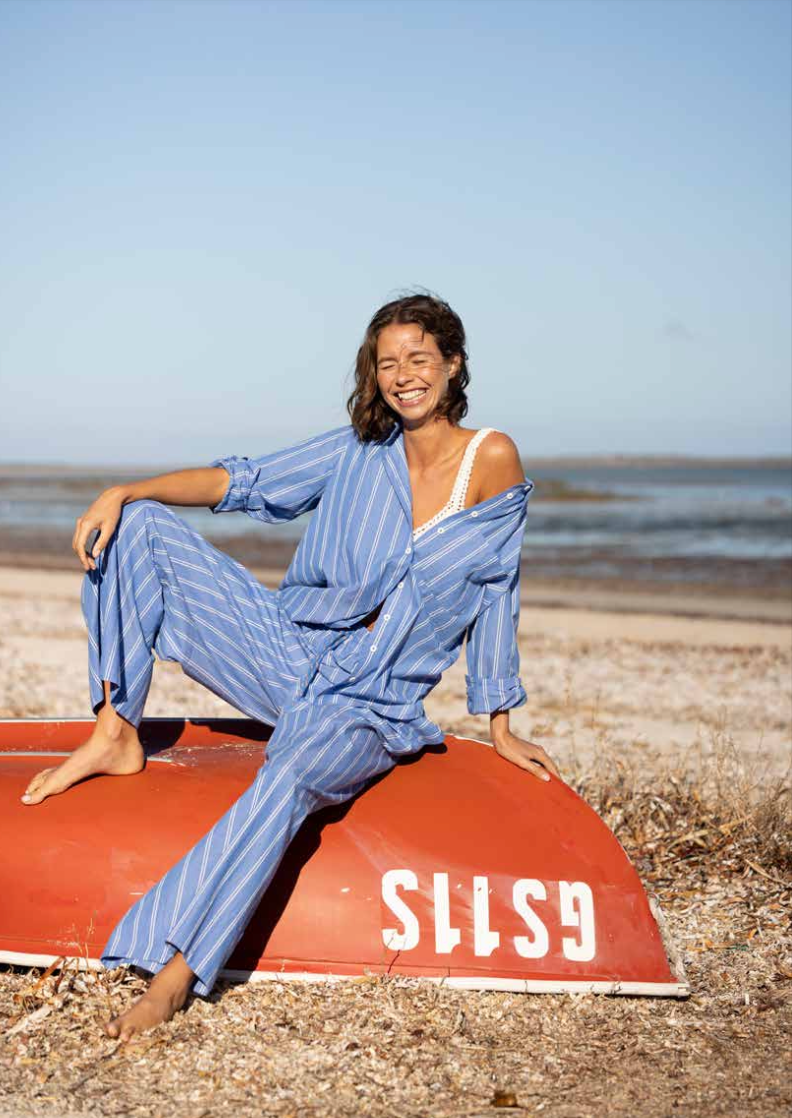 100% Cotton Stripe Wide Leg Pants with Contrast Waist Tie & Side Pockets.
