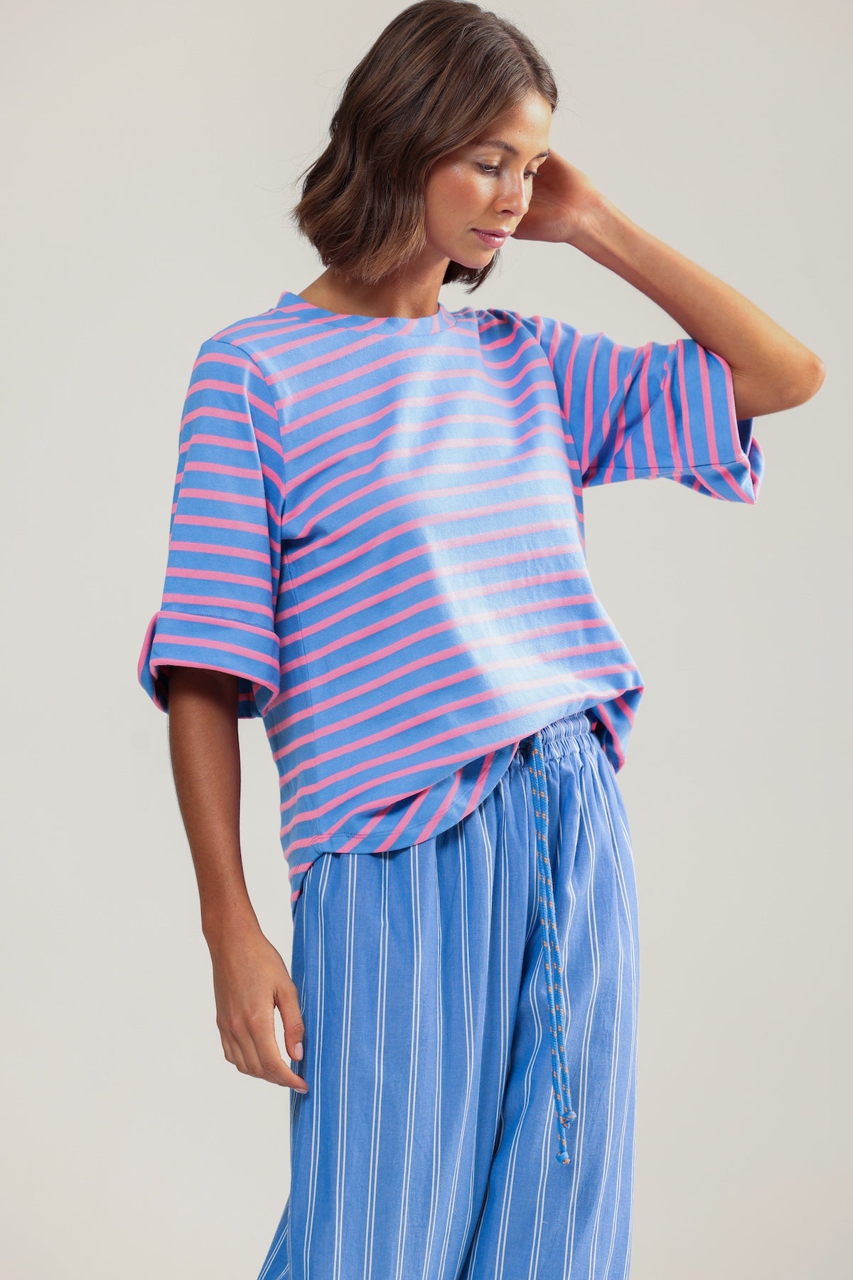 Cotton Tshirt, Wide Neckline, Cuffed Sleeves & High-Low Tails.