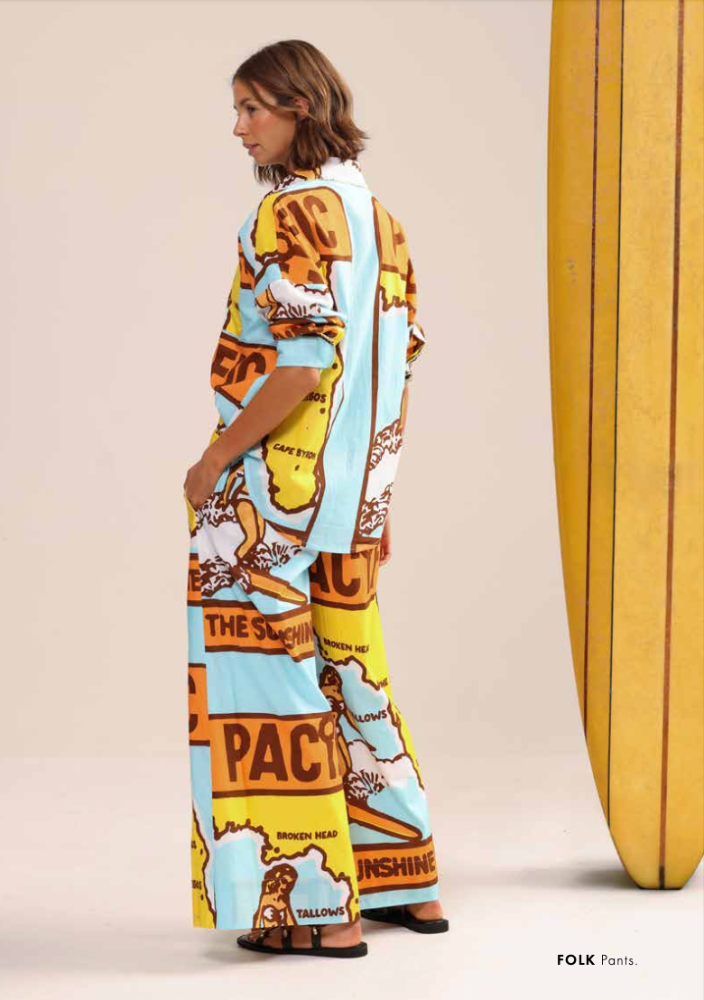 100% Cotton Wide Leg Pants with Yellow Quilt Stitch Detail, Fly Front, Elastic Back Waistband & Side pockets.