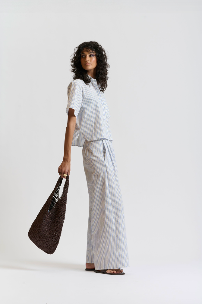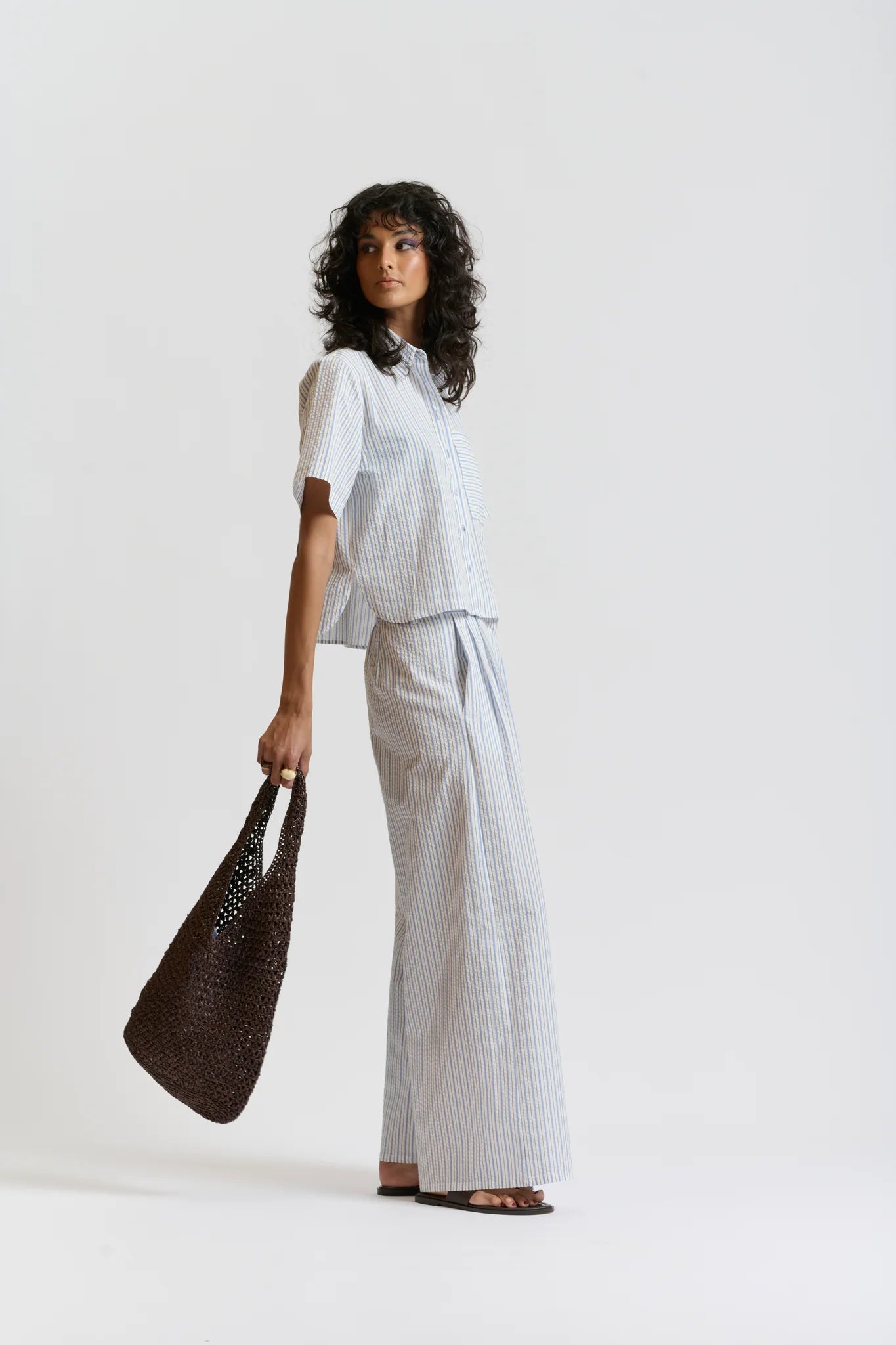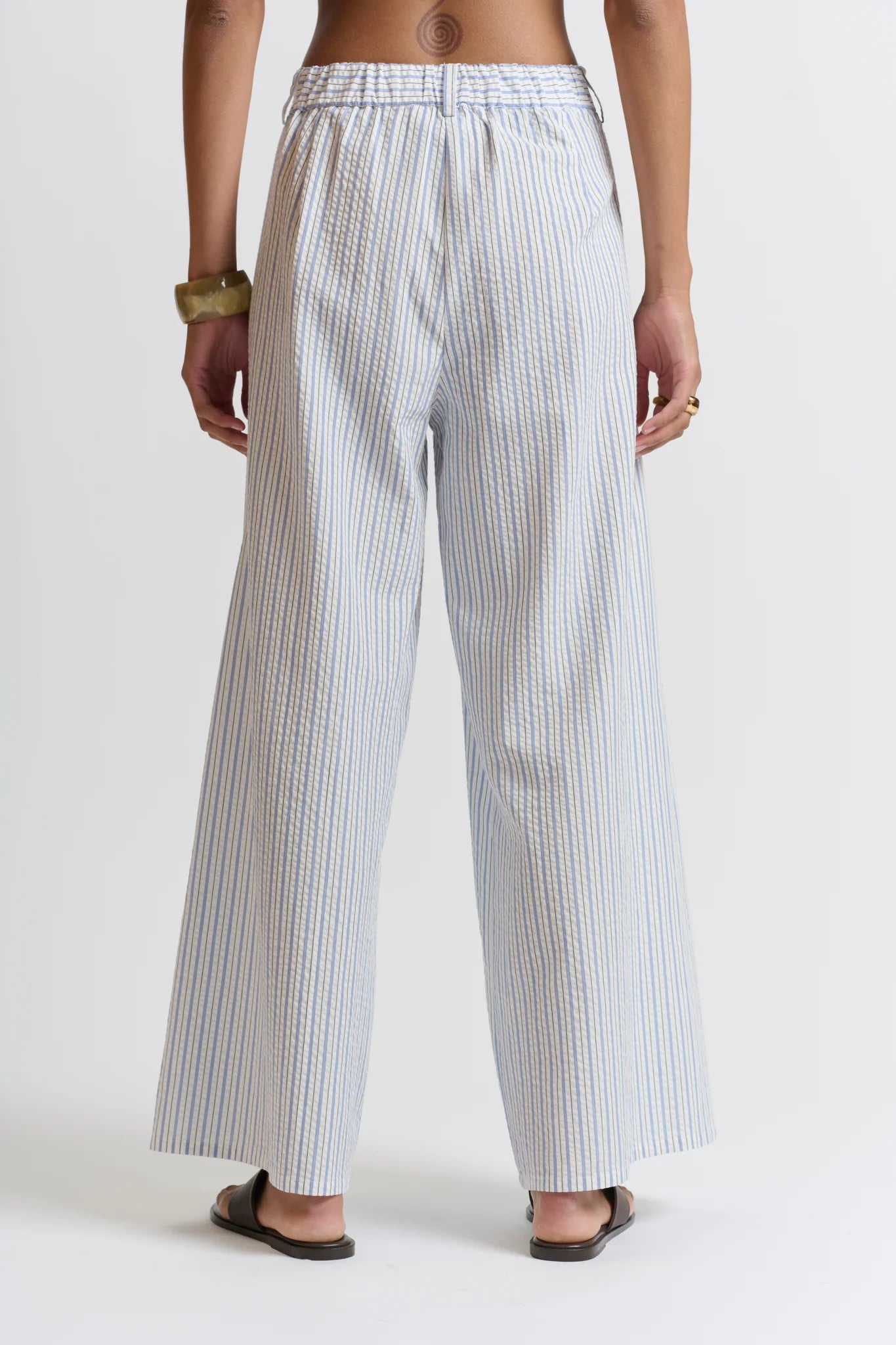 This is your perfect go to Summer pant. Made from pure cotton seersucker in an easy blue/black/white pinstripe it goes with everything. Featuring flat front with tucks, side pockets and easy elastic back. These pants look great with the matching shirt as a set or with our washed cotton voile shirts or tees.
