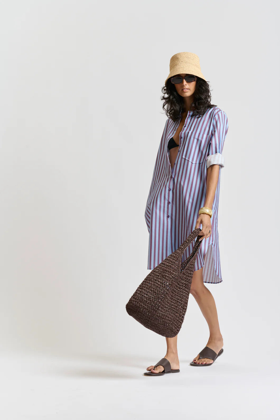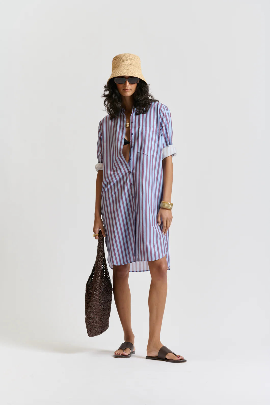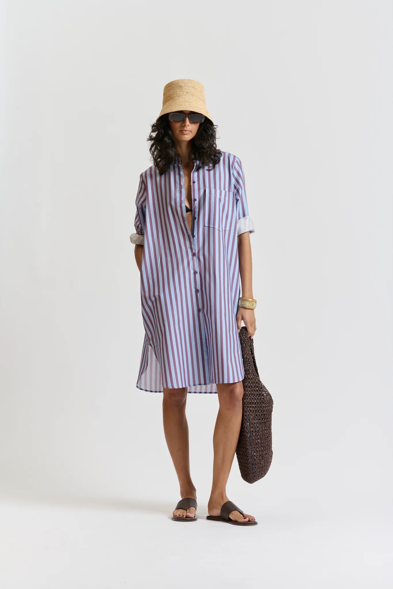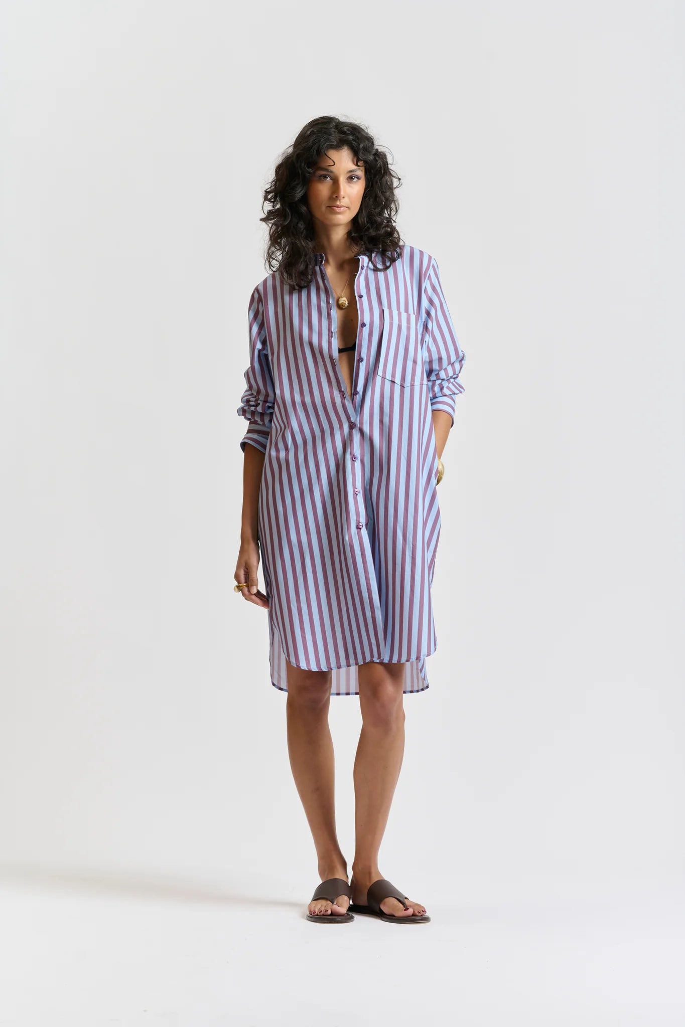 This effortless shirt dress is the perfect beach to bar cover up. Featuring curved hem, splits and side pockets it is effortless and cool. Wear with sleeves rolled up or down. Layer over our cool seersucker pants for a more dressed look. You'll love this new colour combo in pure light weight cotton poplin.