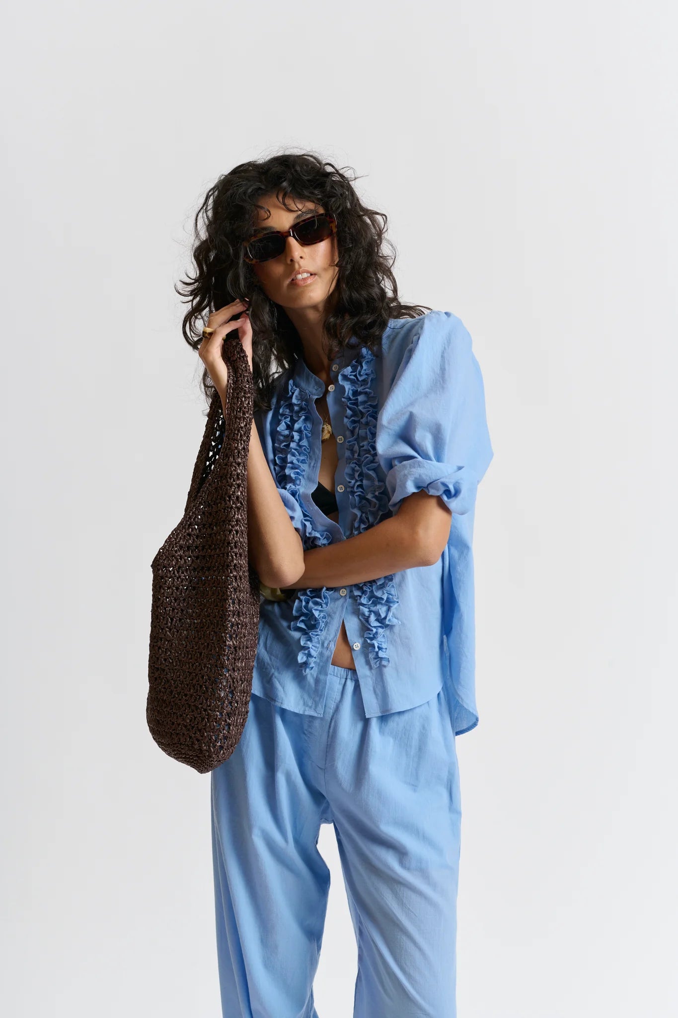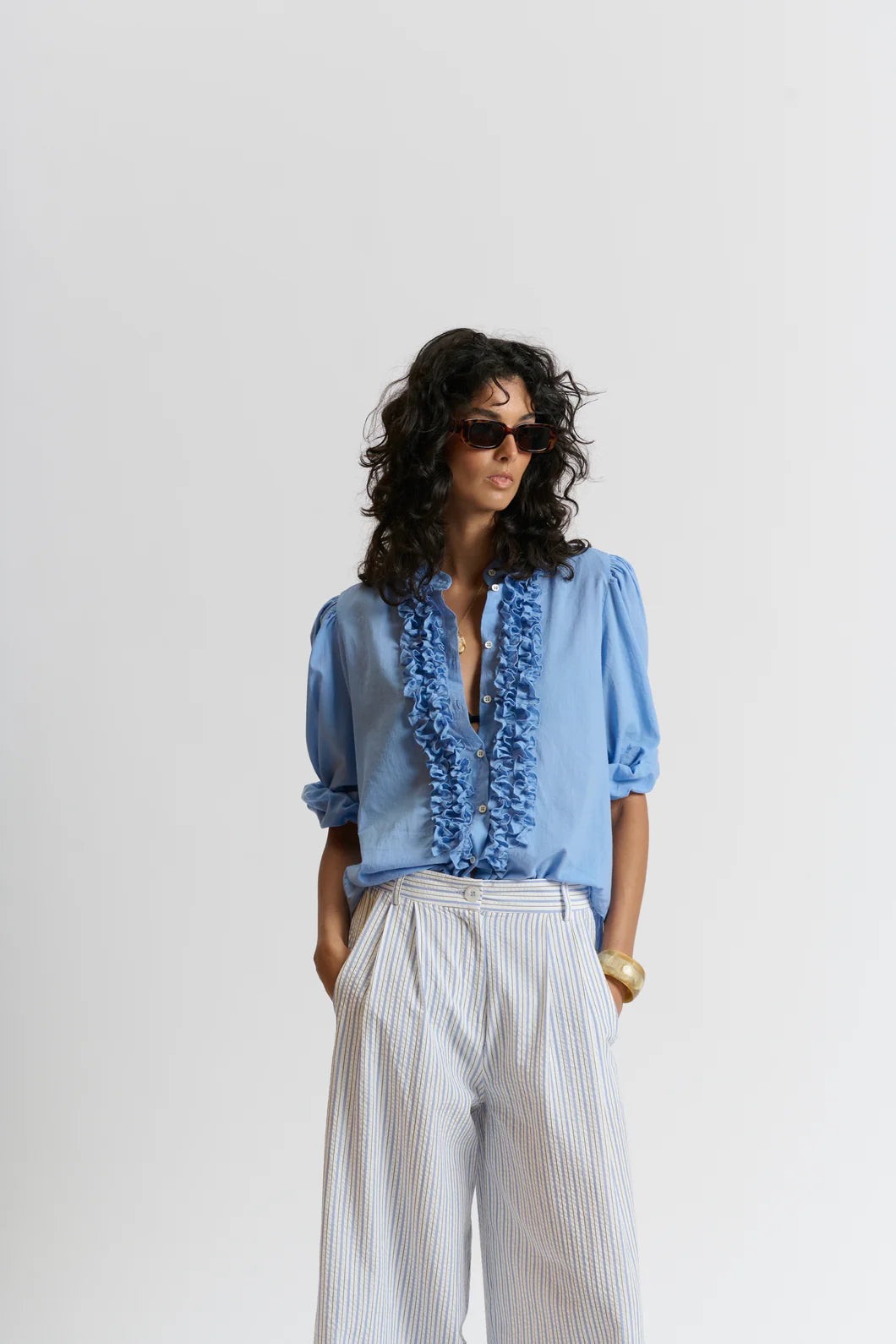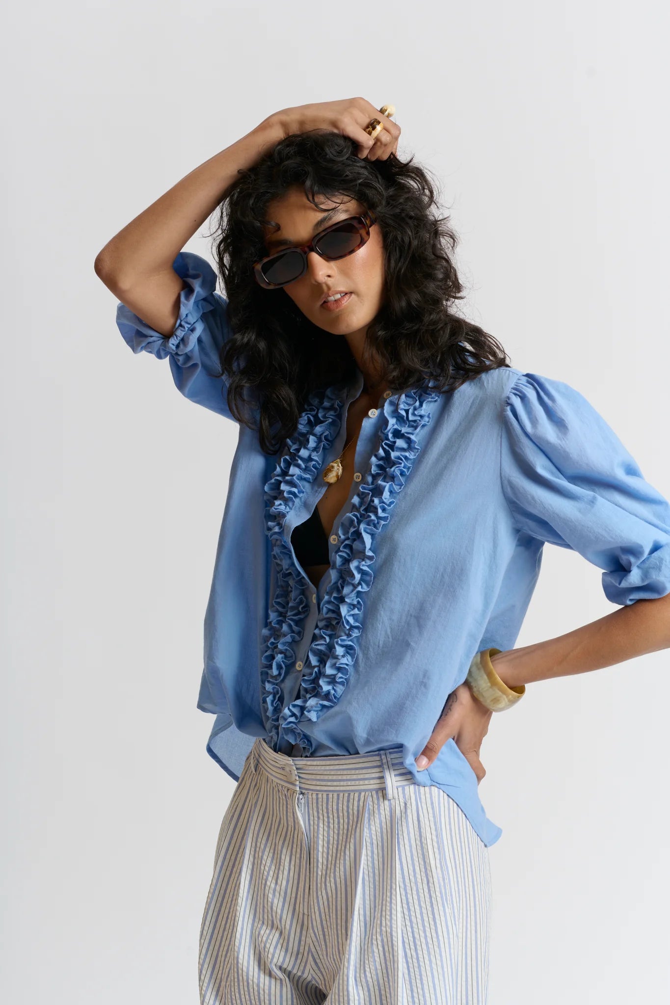 This seasons most effortless chic shirt. A timeless shape with centre front frill detail and elastic cuff sleeves it looks chic with sleeves rolled up - pair back with our seersucker pant or faded denim or match back with the matching washed voile pant. Featuring a soft washed voile that feels so soft and light against your skin you'll never want to take it off.