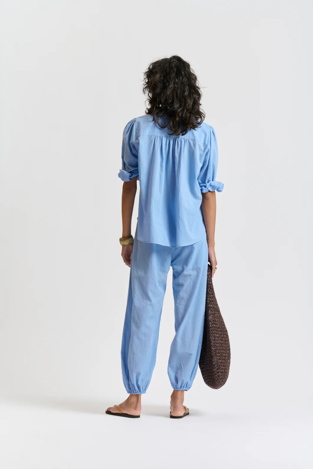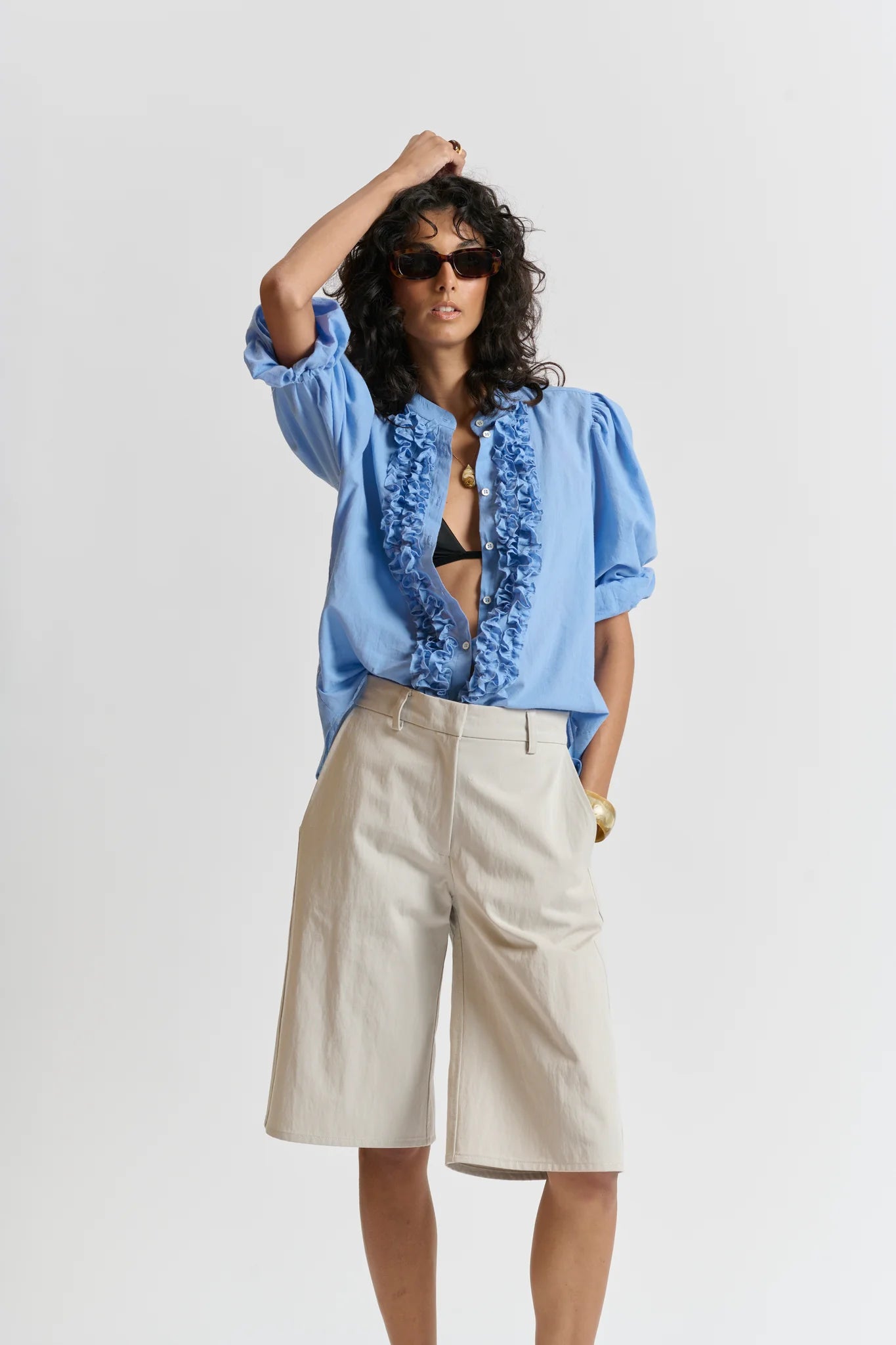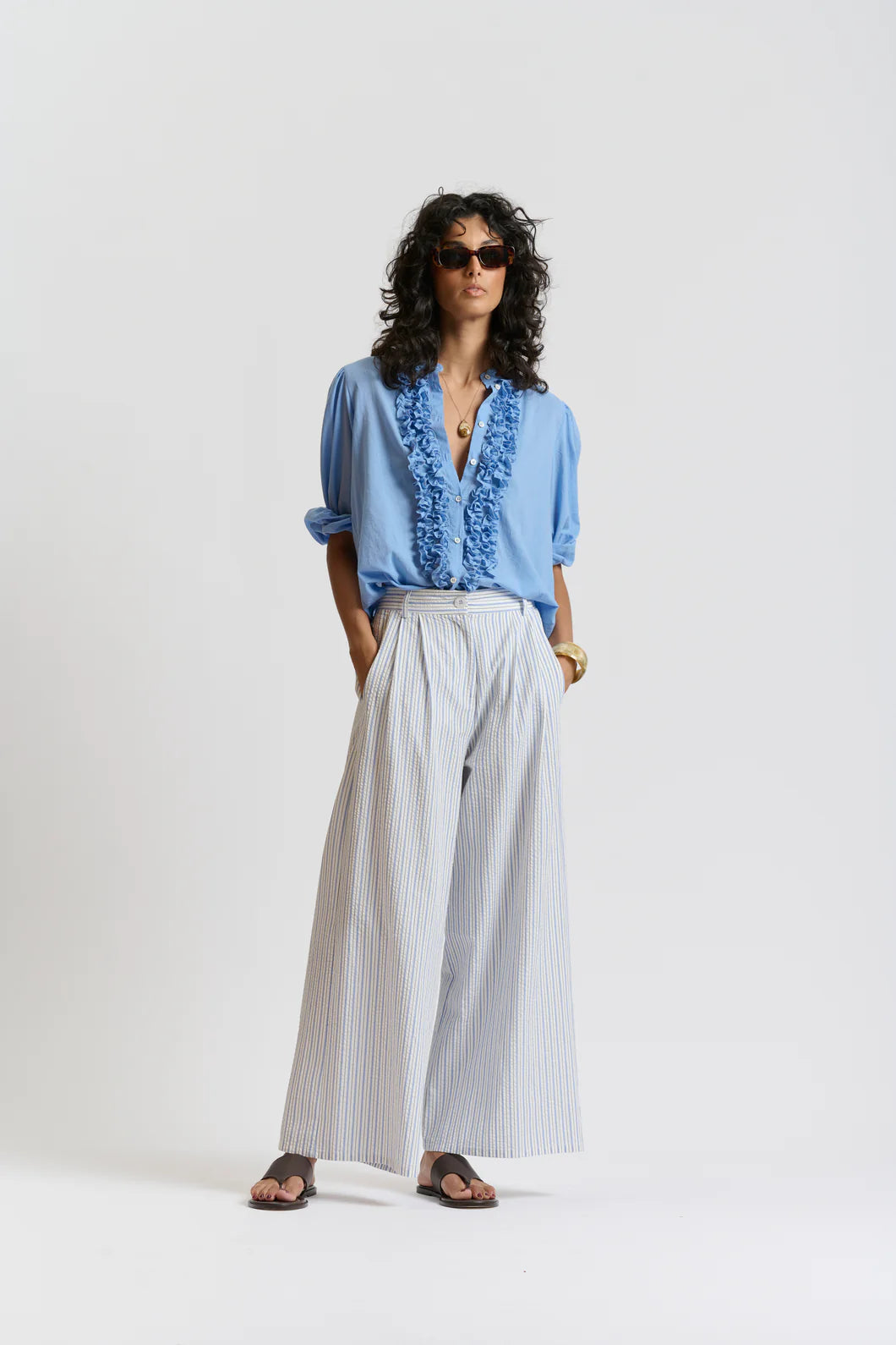 This seasons most effortless chic shirt. A timeless shape with centre front frill detail and elastic cuff sleeves it looks chic with sleeves rolled up - pair back with our seersucker pant or faded denim or match back with the matching washed voile pant. Featuring a soft washed voile that feels so soft and light against your skin you'll never want to take it off.