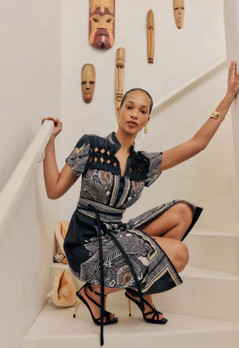 Cut from a luxurious blend of linen and viscose, this flowing midi-length dress in Onyx Casablanca is a masterpiece of relaxed elegance, showcasing a beautifully detailed diamond smocked yoke and a striking heritage-inspired placement print.