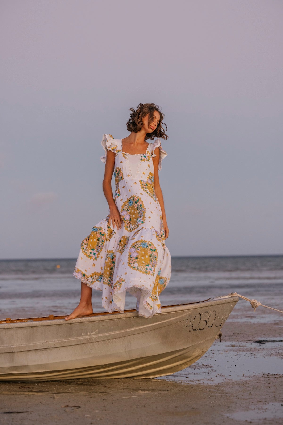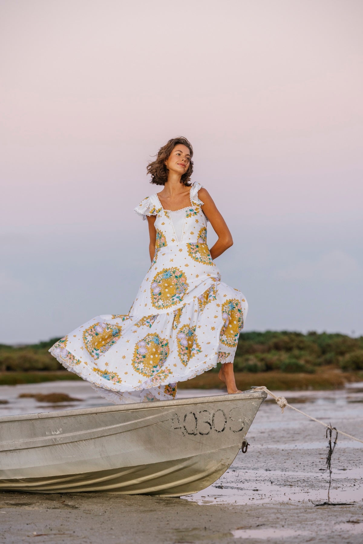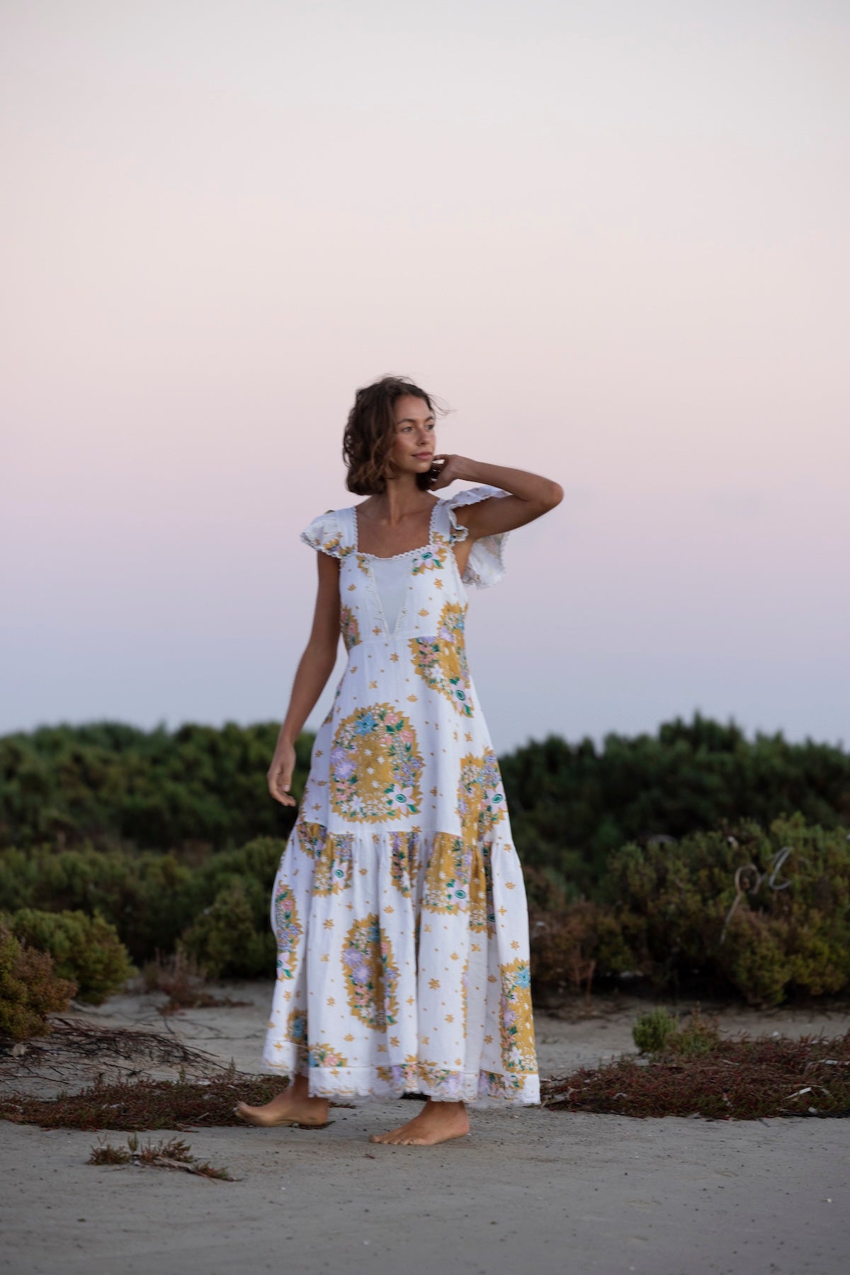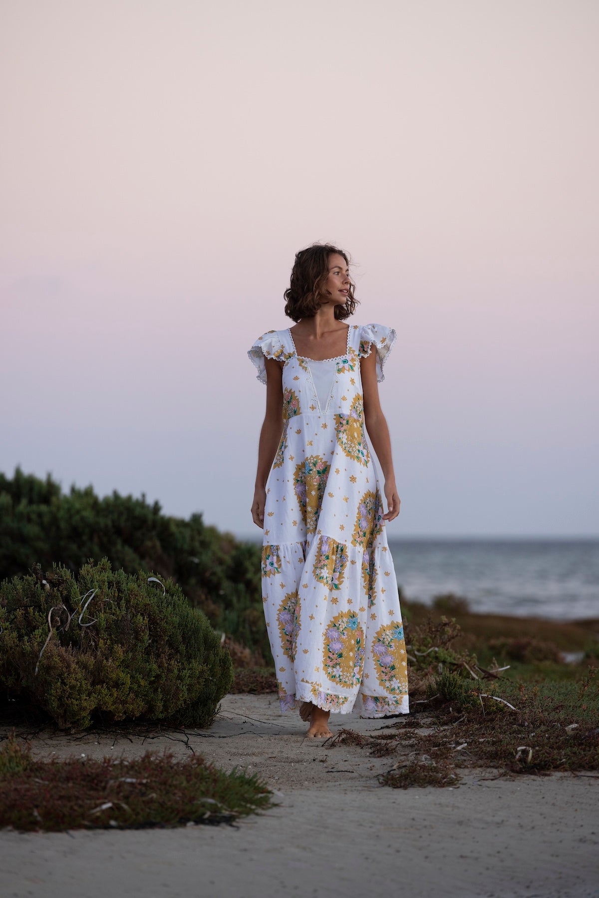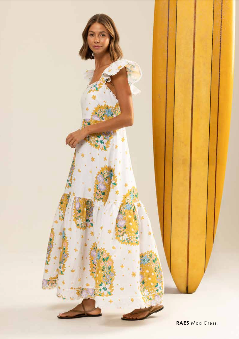 100% Cotton Poplin Maxi dress with Embroidery Details, Ruffle Sleeves, Shirred Back & Removable Waist Tie.
