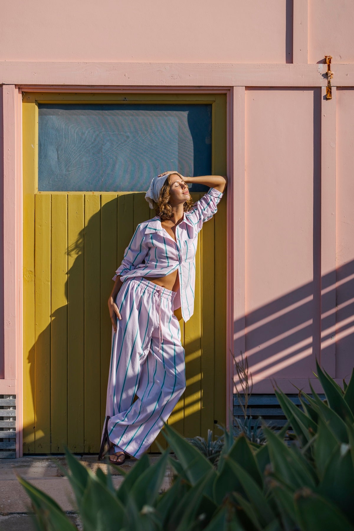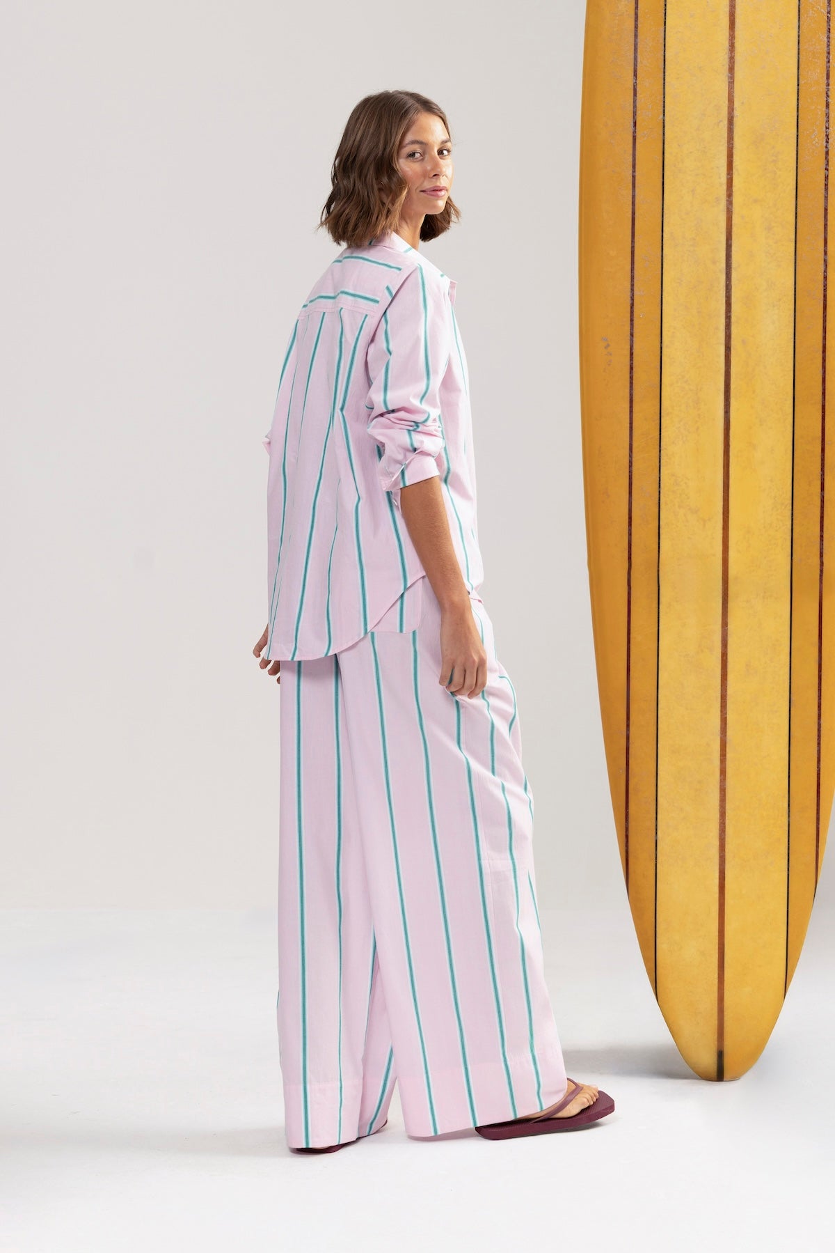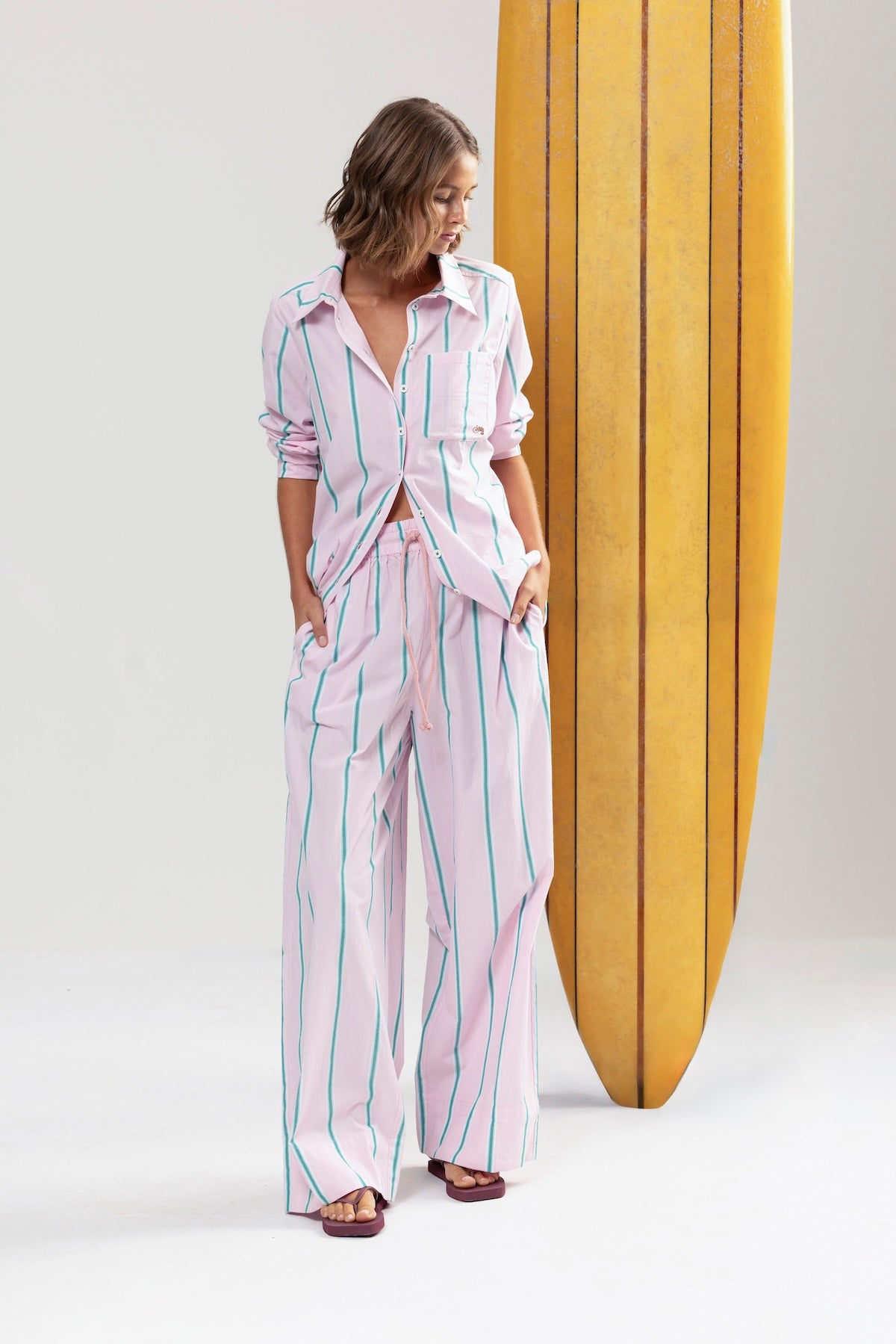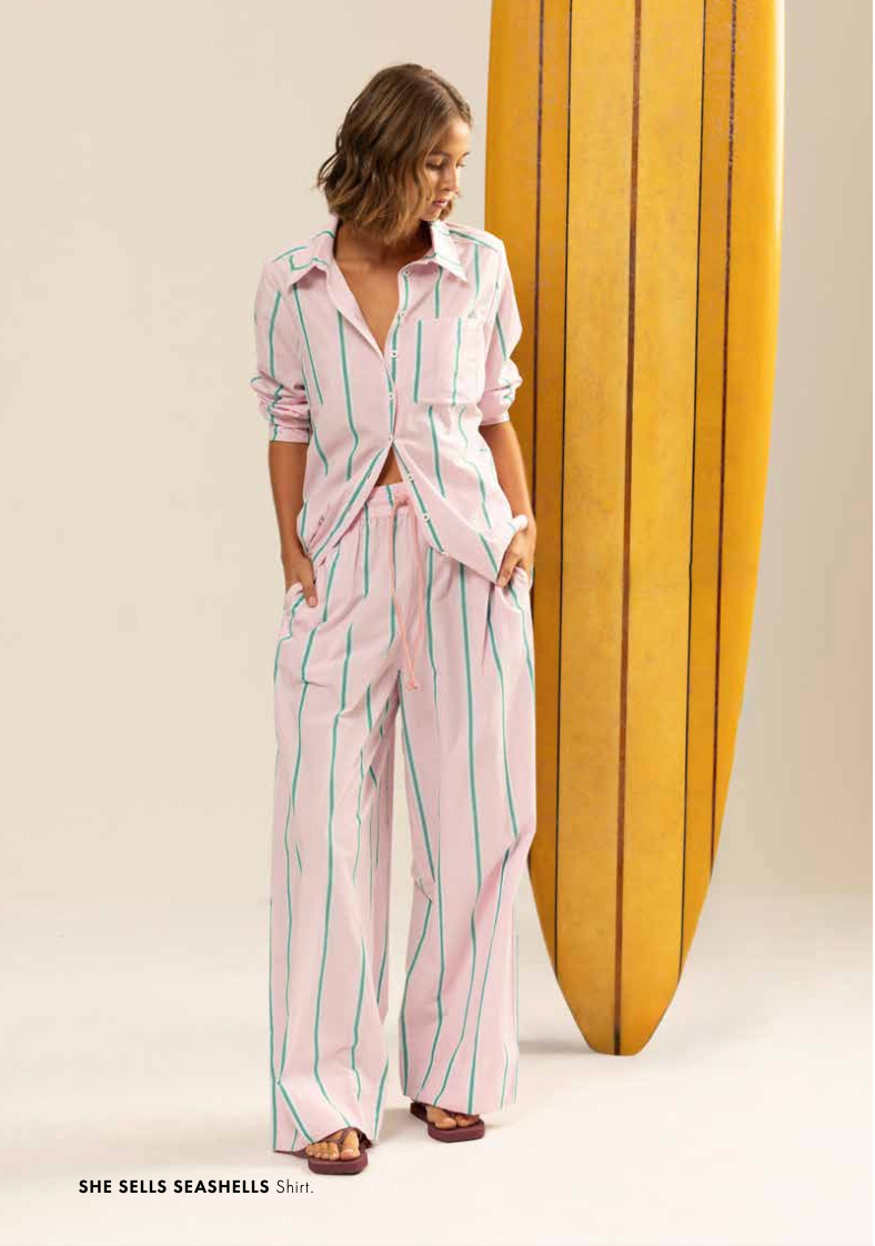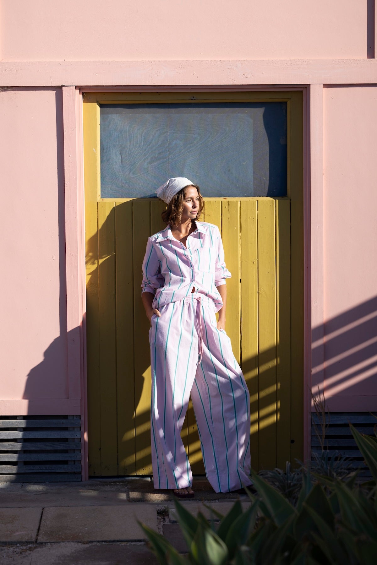 Yarndye cotton stripe in baby pink, white & green with a embroidered baby prawn friend on the pocket. It’s your not-so-basic button-up. Set & Forget how cool you look in our OFFSHORE matching pant.