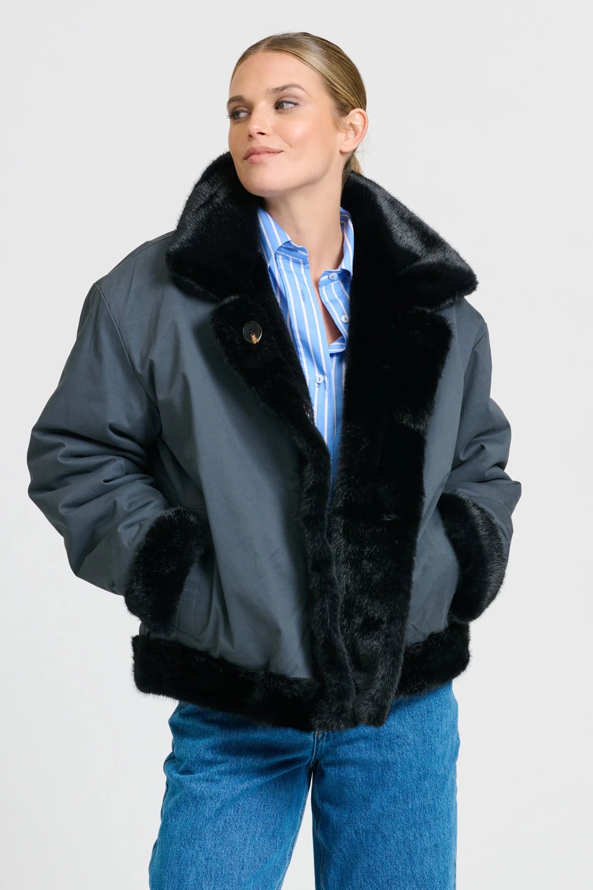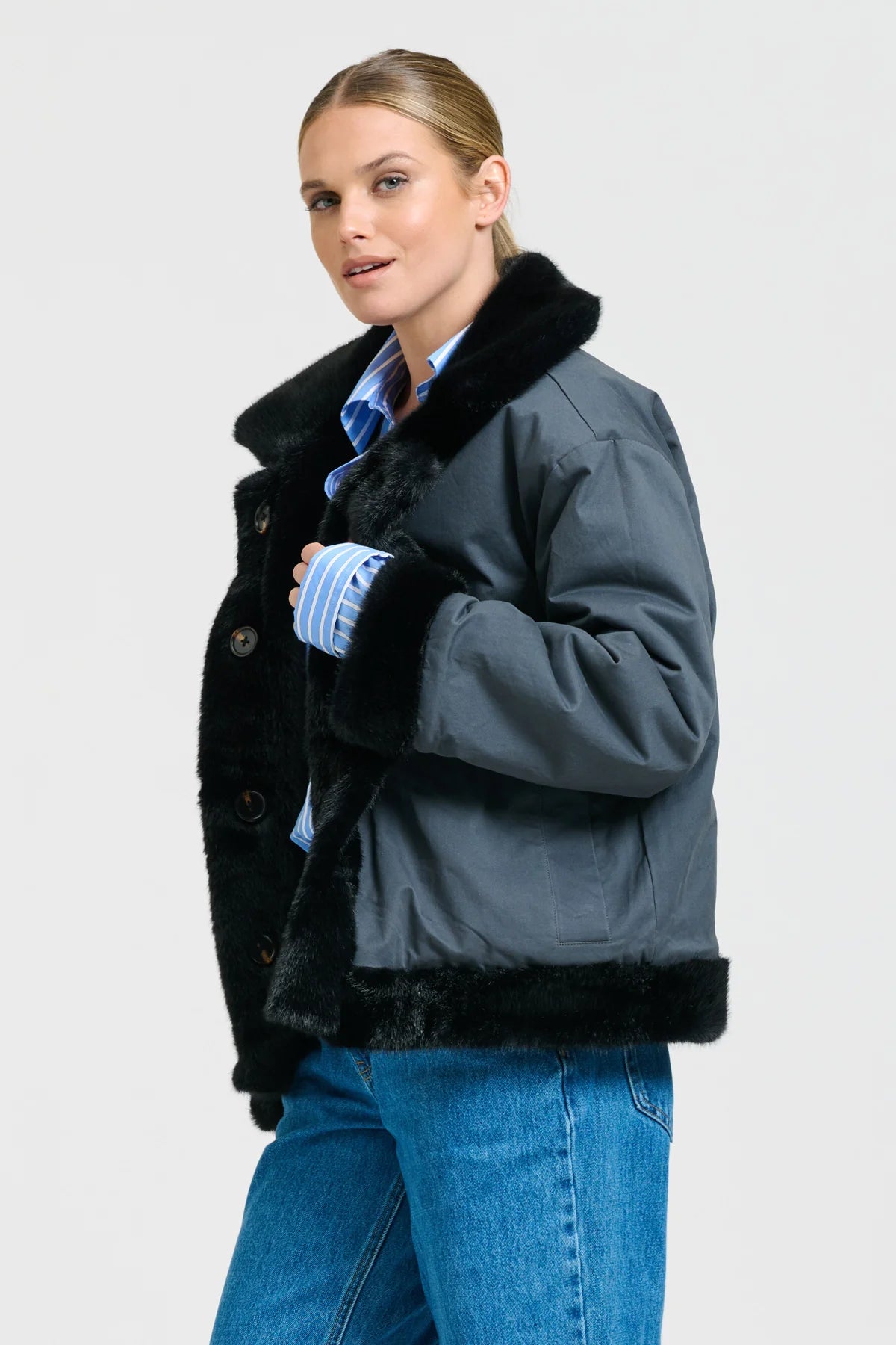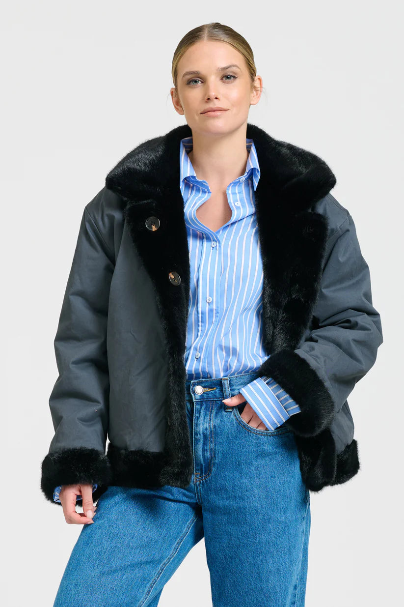 This Reverso Jacket is a versatile, reversible piece made from premium faux fur and washed cotton drill—an oversized, stylish essential you’ll wear from day to night all winter long.