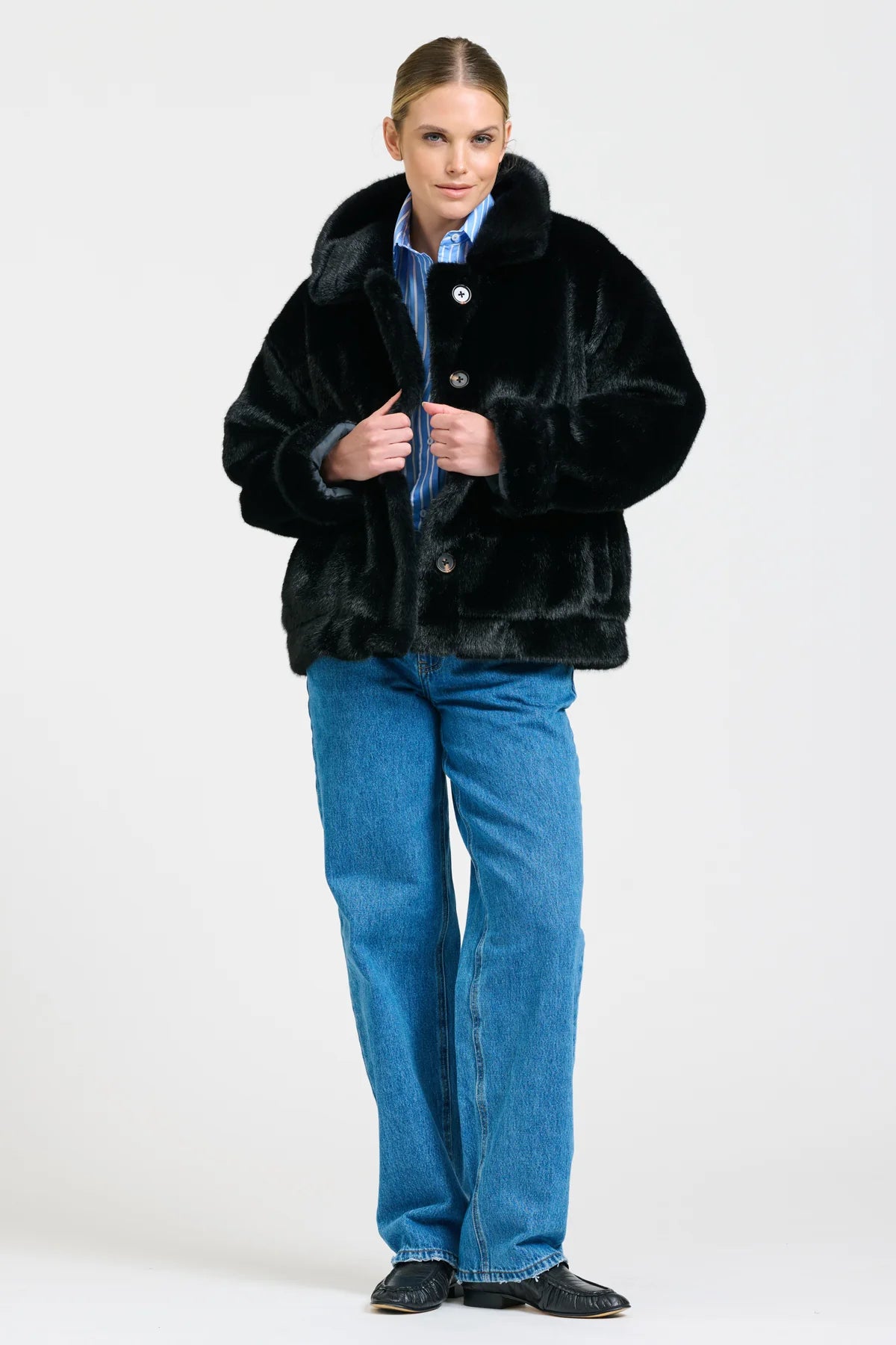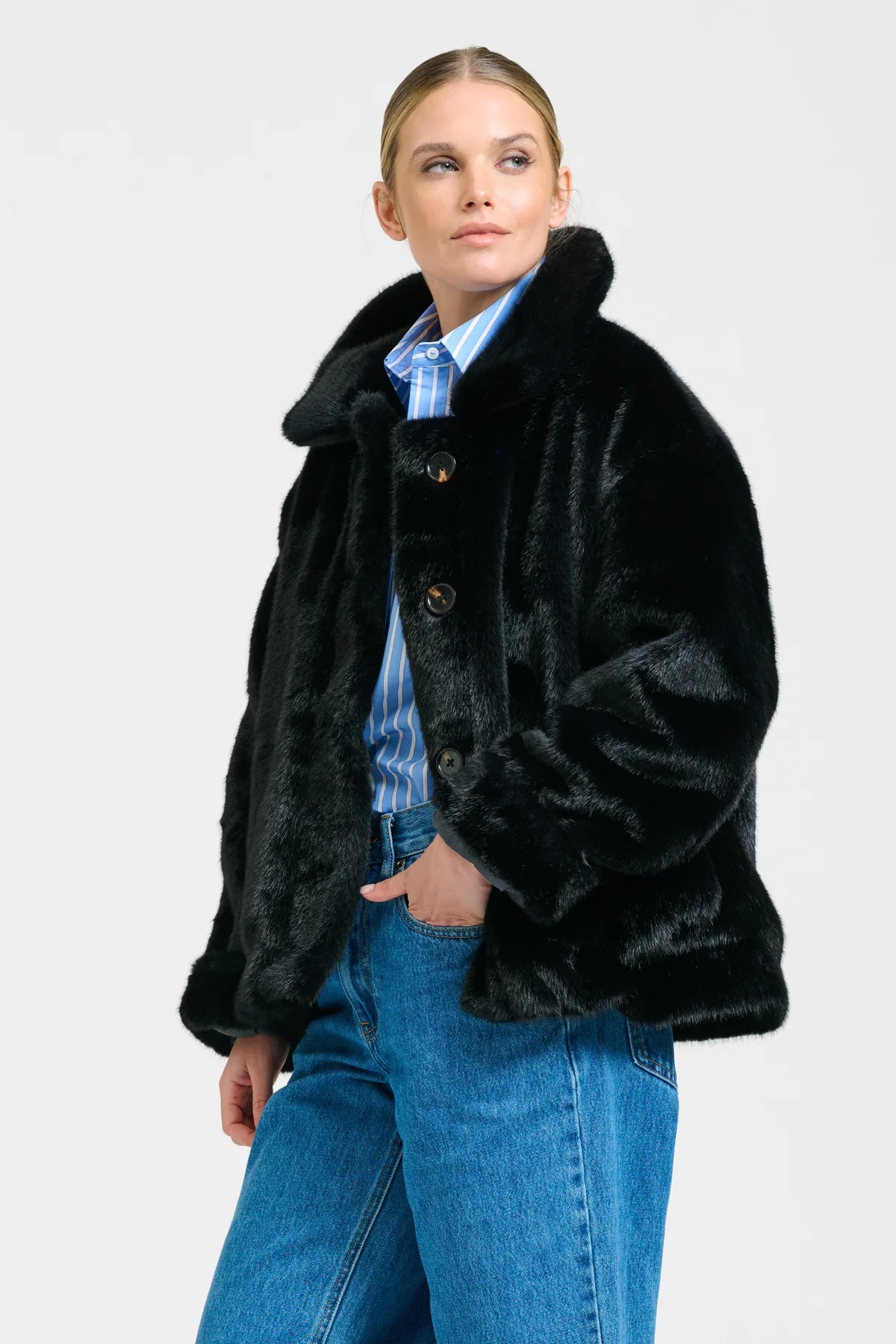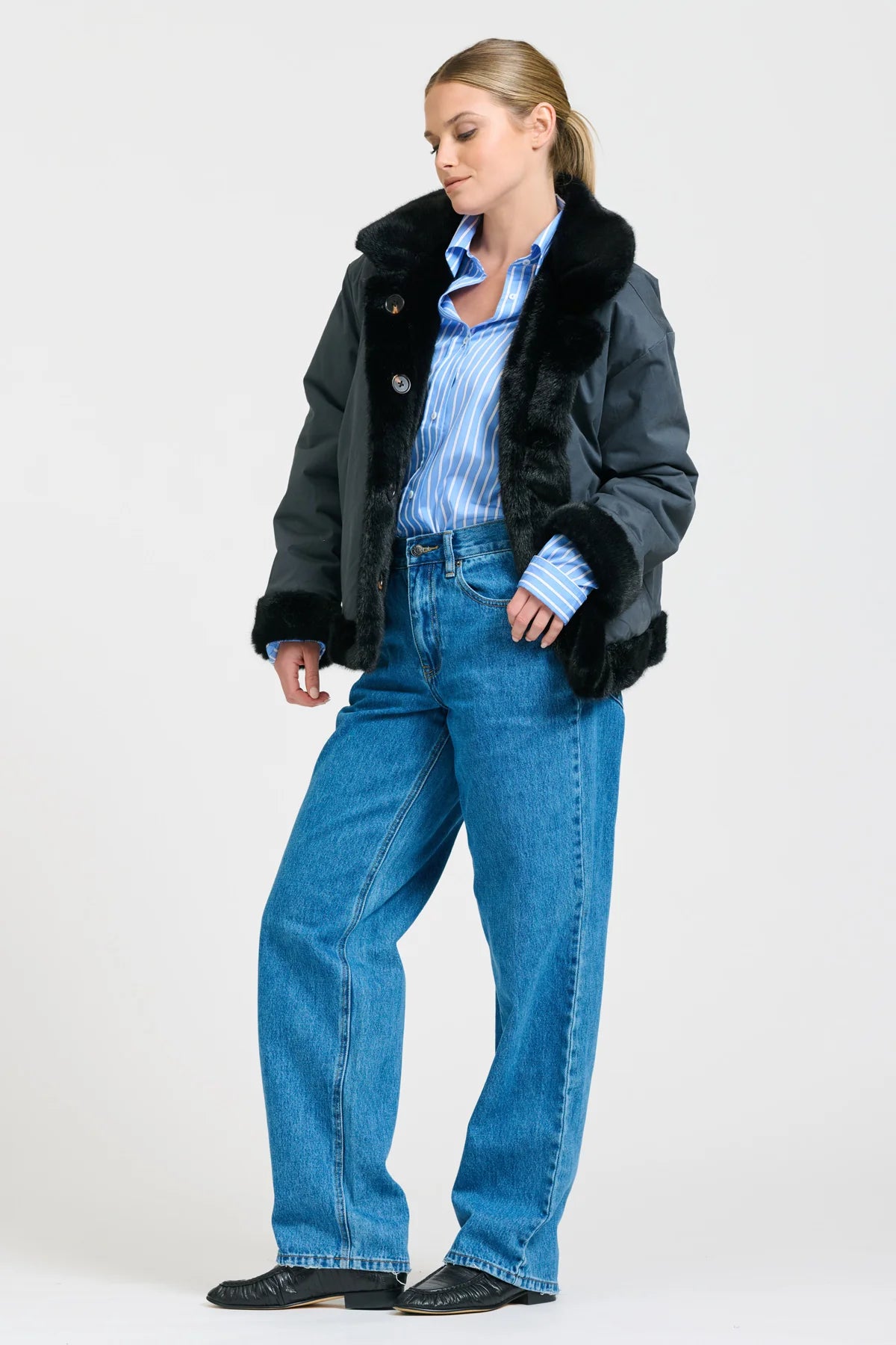 This Reverso Jacket is a versatile, reversible piece made from premium faux fur and washed cotton drill—an oversized, stylish essential you’ll wear from day to night all winter long.