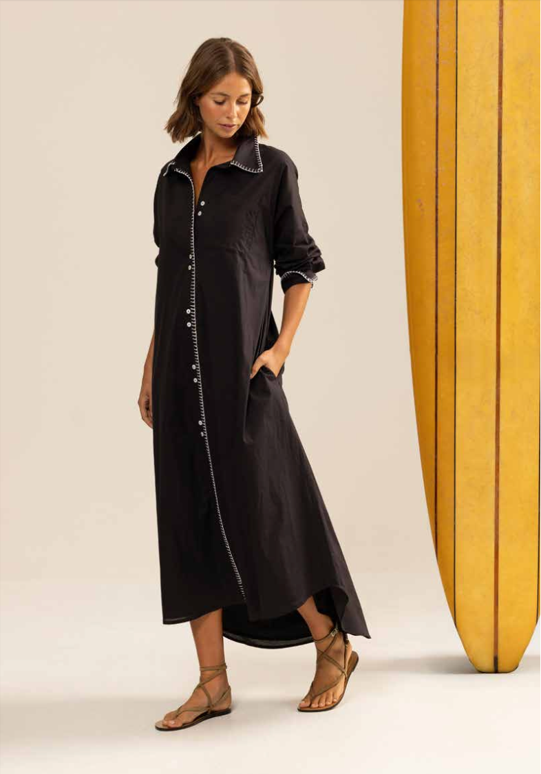 100% Cotton Midi Length Shirt Dress with White Quilt Stitch Detail, Contrast Buttons, Side Pockets & Removable Waist Tie.
