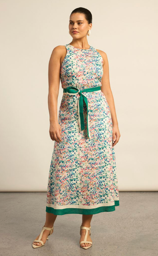 the dusk dress is shaped with a high rounded neckline and sleeveless fit-and-flare profile. a waist seam with a self-tie belt refines the shape, while a midi length adds polish to everyday outfitting. finished with an invisible zip and covered button closure at the back, it’s a modern piece designed for versatility.