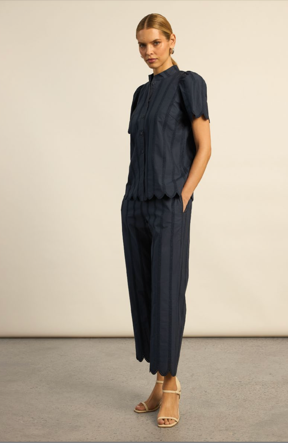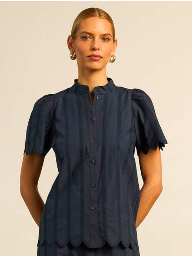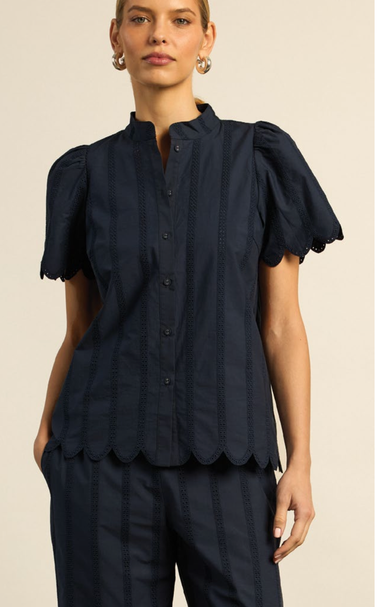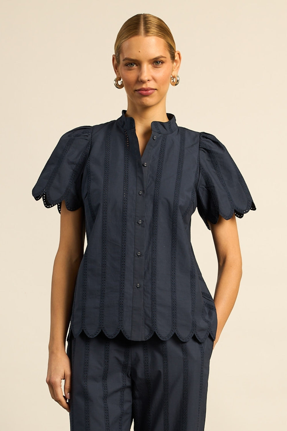 the pier top is elevated with cotton broderie that finishes in scalloped cuffs and a scalloped hem. a high neck-stand lends structure, while colour-matched fabric buttons elevated with classic shirt with a twist. designed for versatility, it pairs seamlessly with the harbour pant for an elegant seasonal look.