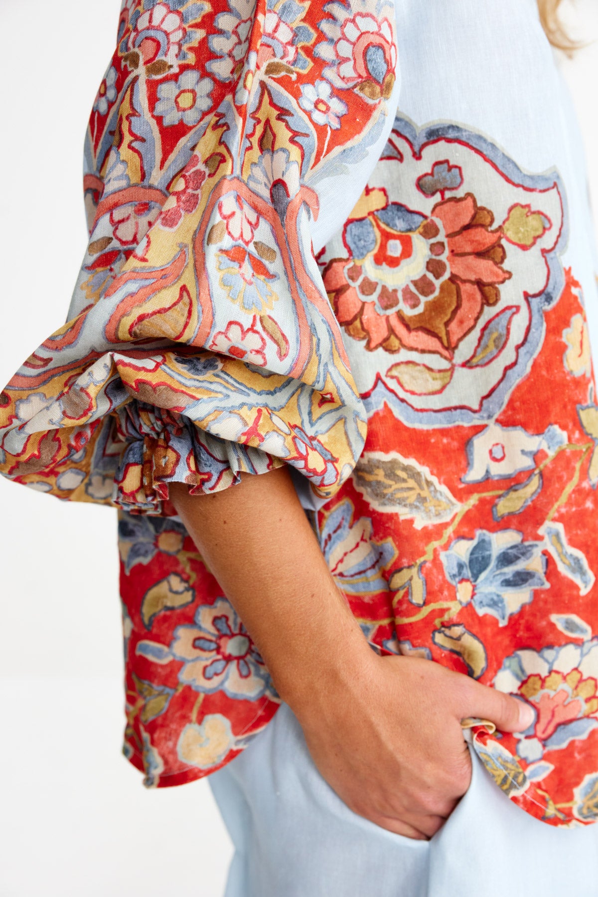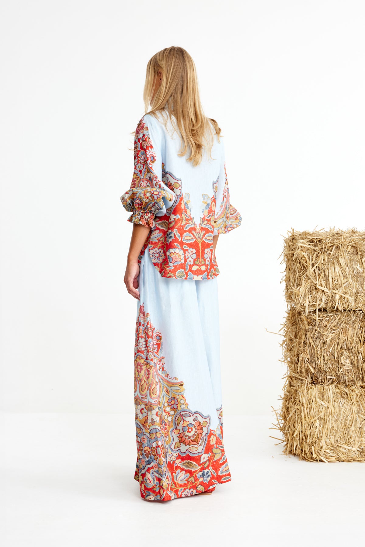 For all the horse girls. That obsessed over ribbons & rosettes. Just to win one, would bring months and months of joy. Just like our namesake shirt bringing blue-ribbon attitude with puffed-up sleeves and a rich gem stone hue persian print that takes out Best in Show. Will bring joy forever to the wardrobe paired back with our matching Plaiting pants or imagine white wide leg denim. Crafted in our sky blue linen-viscose blend, shirt tails, pretty puff sleeves  (& second helpings at lunch).