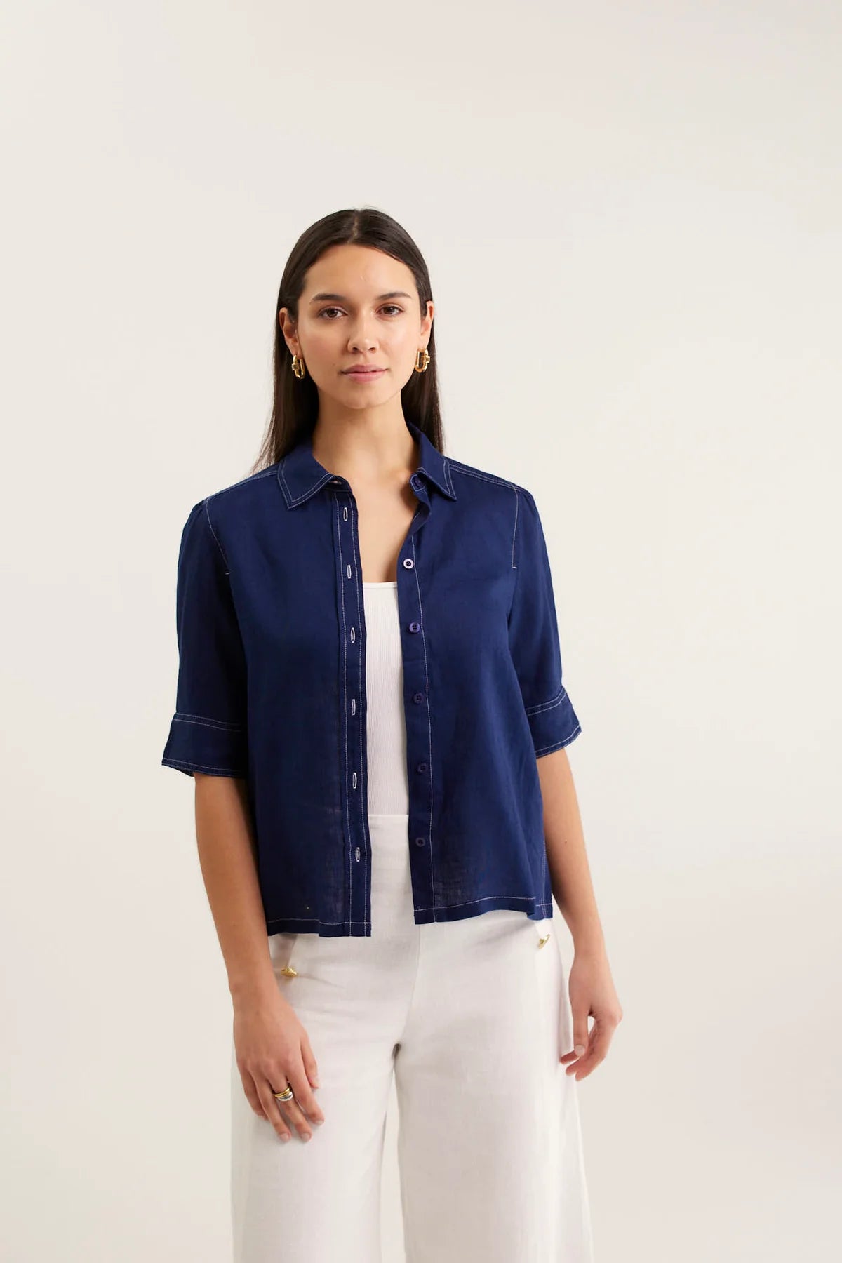 100% LinenNavyCollared, Button Down ShirtShort, Puff SleeveCold, gentle hand wash