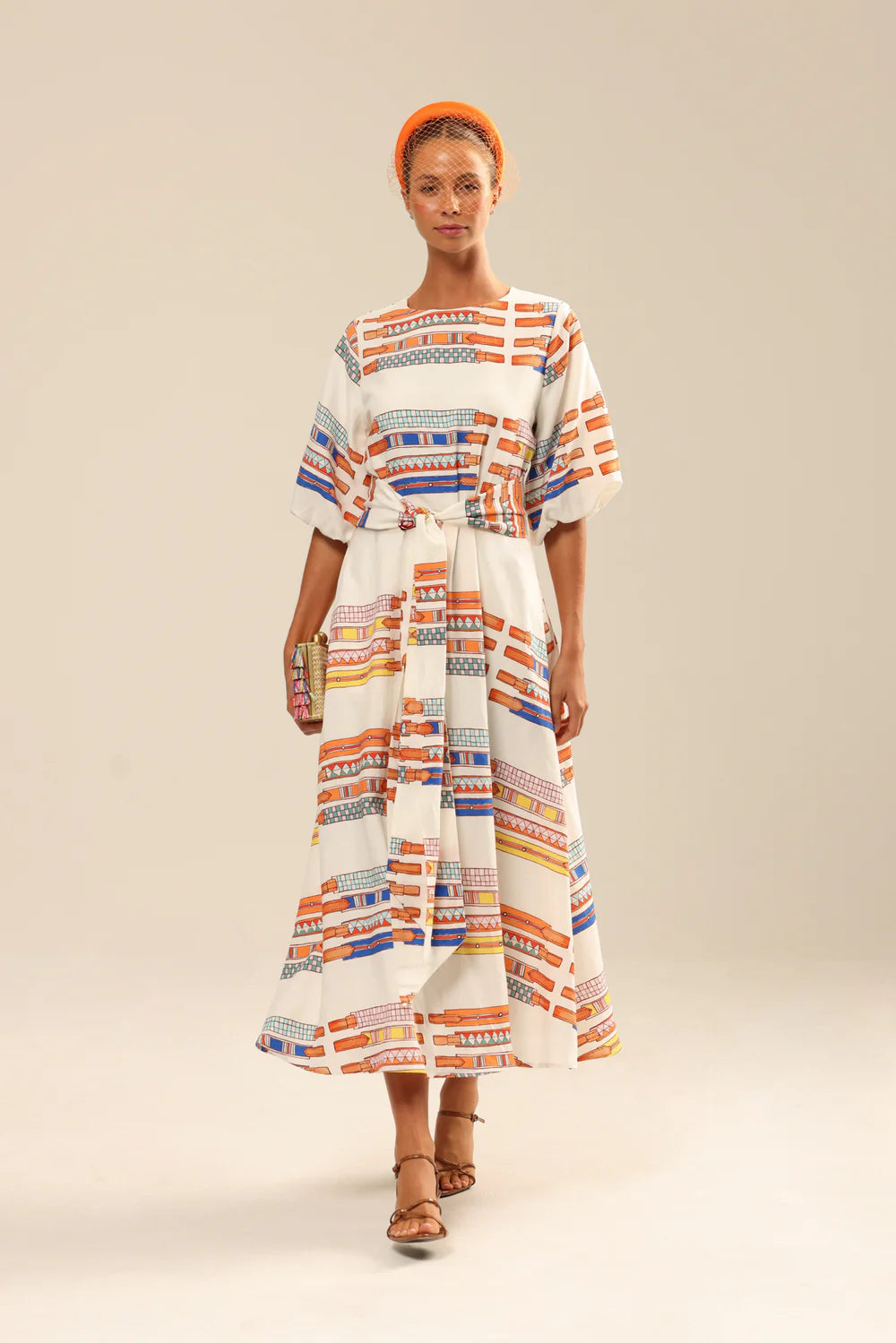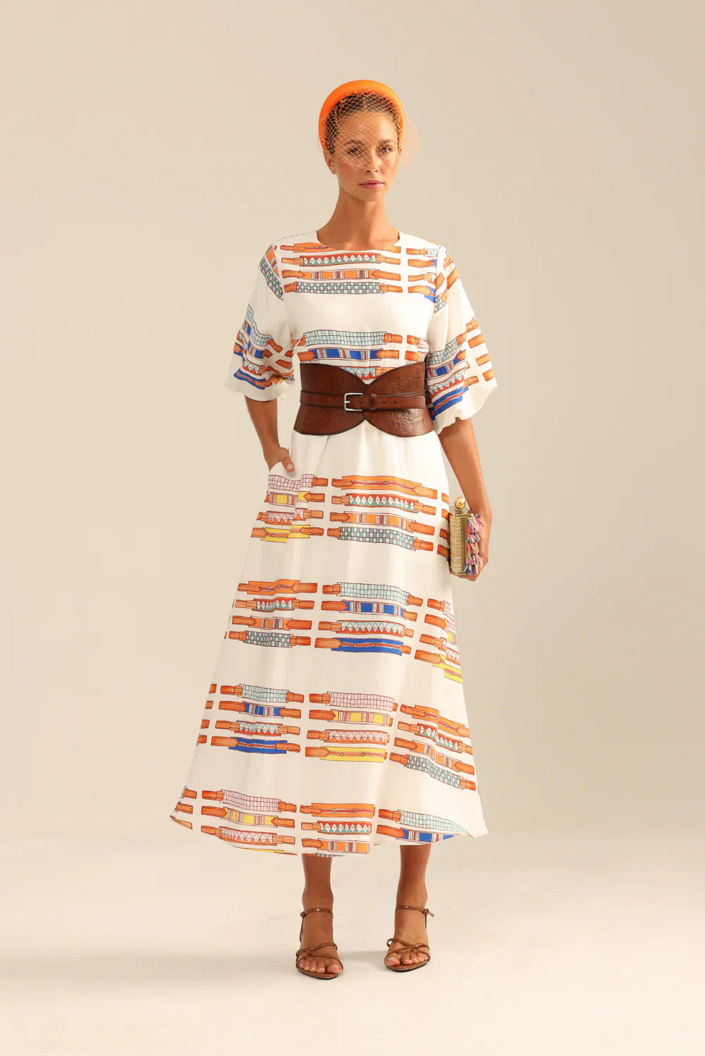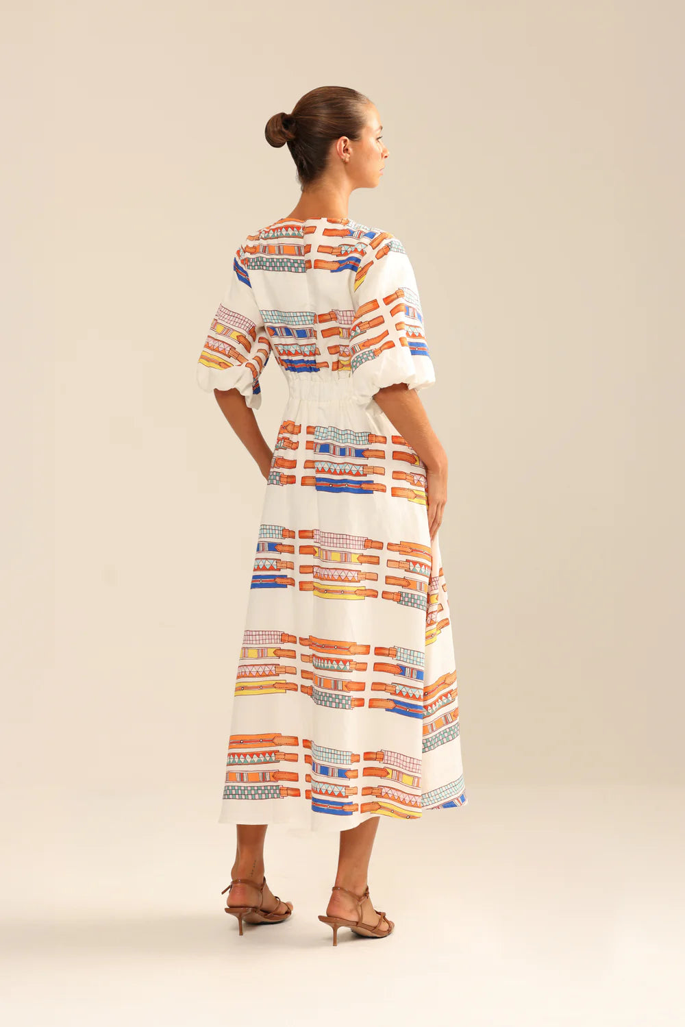 There was also nothing in the world that made our horse mad heart beat faster growing up than plaited ribbon browbands. We LOVED. So we handpainted six of them beautifully onto to this perfectly cut midi dress. Cut in a beautiful silky viscose linen blend, with gently puffed sleeves. Wear with or without self belt or add your own. Saddle Up.