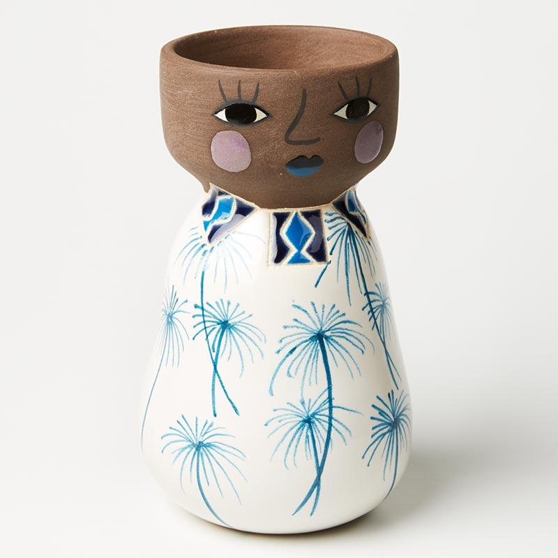 Bring a jungalow vibe to your space with the earthenware Miss Lola Vase. Full of tropical details with her necklace and palm tree motif dress she loves to be filled with tropical leaves and flowers. Dimensions: Length 11.5 Width 11.5 Height 20