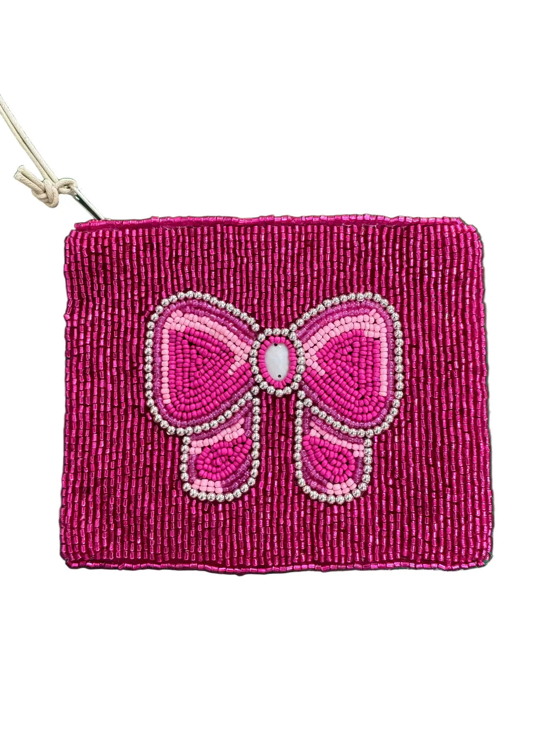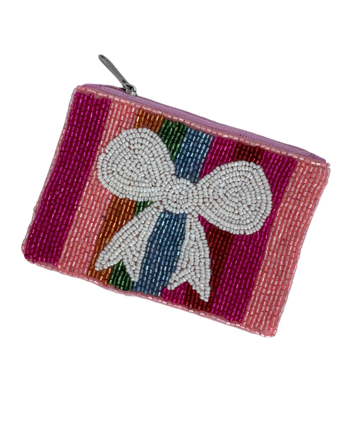 This playful Beaded Bow Coin Purse brightens your day Crafted from soft light pink cotton and sized at 13cm by 9.5cm, it fits perfectly in your pocket or bag. The secure zip closure keeps your coins safe while offering easy access to your change. A fun and compact accessory to carry your essentials with a touch of whimsy.