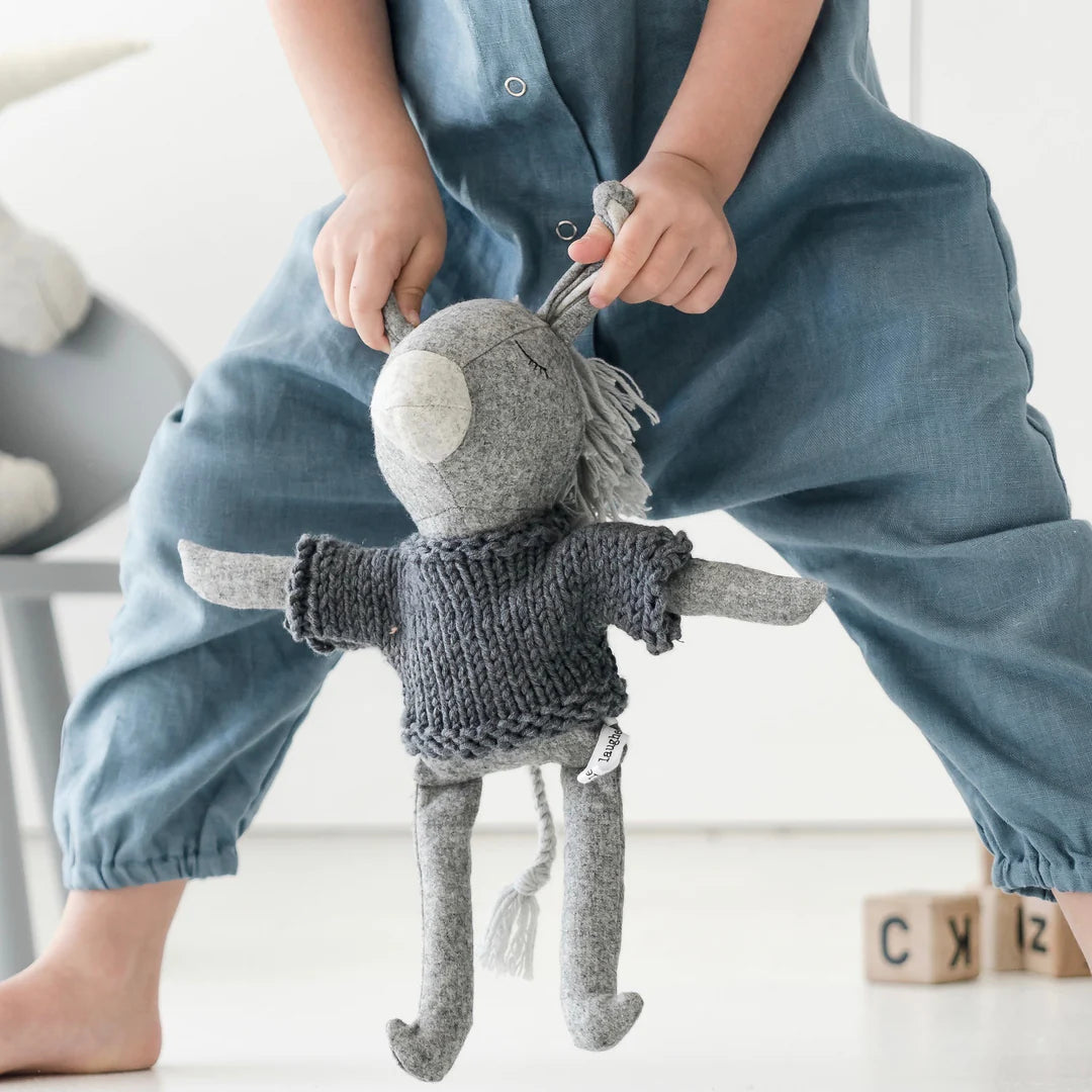 Made with the softest wool blend fabric, Oscar wears a hand knitted Australian merino wool grey jumper